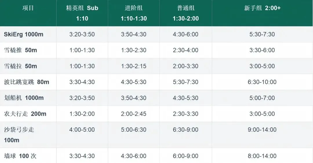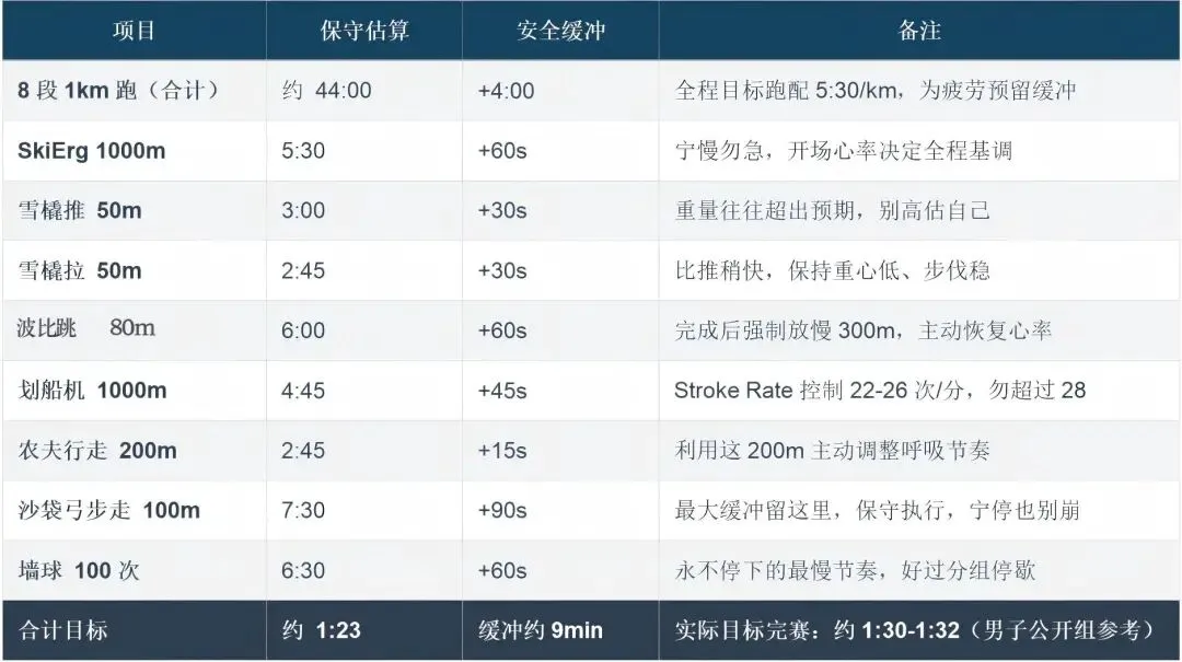 还有一个被忽视的因素:SkiErg是全场第1站。你在这里建立的心率水平,决定了整场比赛有氧系统的运行基准。开场过猛,后面每一个跑步段、每一个站位的恢复能力都会打折扣。