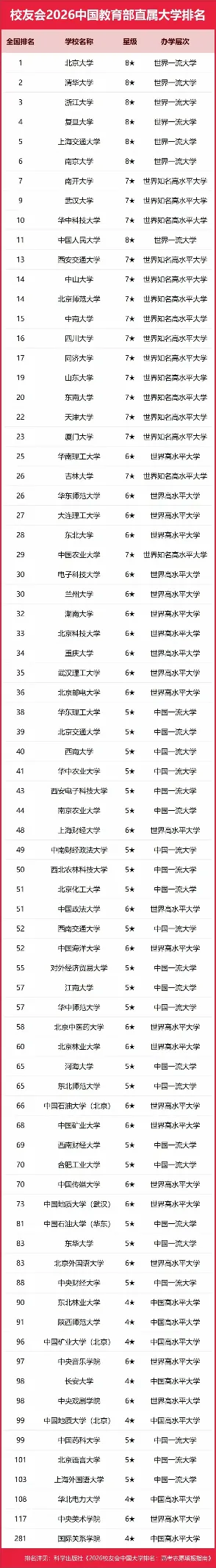 2026年我国“教育部直属”大学排名!武大第八,人大第十,北师大第12,同济大学17,东北大学28,北京科技大学33,西南大学4