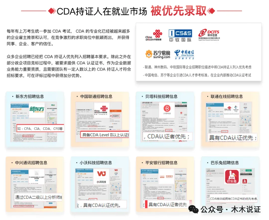 CDA企业认可度如何?CDA企业认可度非常高,很多企业招聘时注明CDA数据分析师优先,对找工作非常有帮助。很多银行、金融机构的技术岗会要求必须是CDA数据分析师二级以上的持证人。中国联通、央视广信、德勤、苏宁等企业,把CDA持证人列入优先考虑或者对员工的CDA考试给补贴。