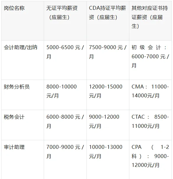 CMA侧重管理会计、成本控制,贴合企业管理层需求,适合想从财会岗转向管理岗的同学。考试只有2科,难度适中,国际认可度高,字节跳动等大厂财务分析岗明确标注“CMA持证者优先”。适配岗位:财务分析员、成本控制主管、财务经理,持证者晋升速度比无证者快30%,薪资涨幅显著,适合有管理意愿的同学备考。2026财会相关岗位持证与无证薪资对比表(全国平均数据)