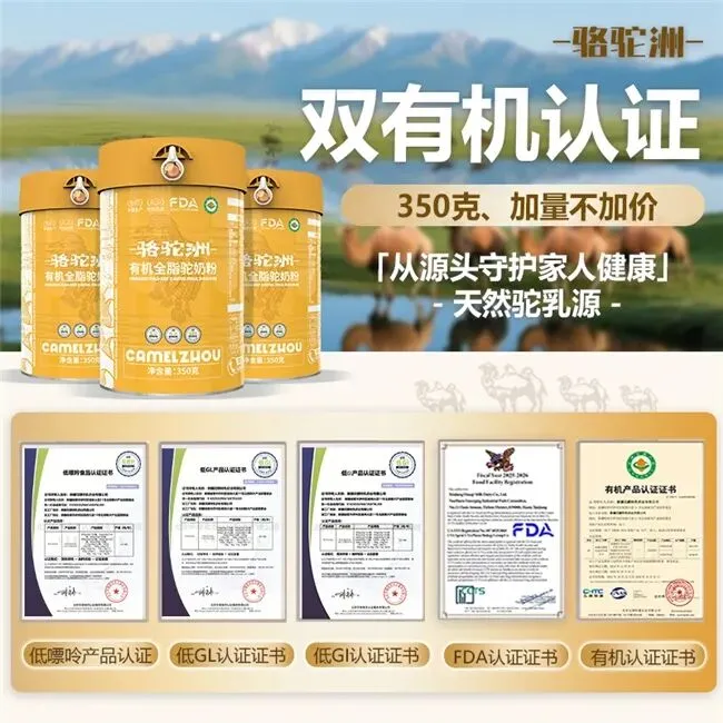 该产品斩获低GI、低GL、低嘌呤、有机食品、食品监督认证五大权威资质,同时通过国际级质量认证,品质达到国际通行标准,完全符合低GI产品认证技术规范,全方位印证产品品质的优越性。与行业常规300克规格相比,骆驼洲有机驼奶粉采用350克加量罐型,实现加量不加价,单罐可满足家庭1-2周的日常饮用需求,大幅提升产品性价比,适配家庭长期营养补充场景,兼顾实用性与经济性,真正实现“优质营养不溢价”。
