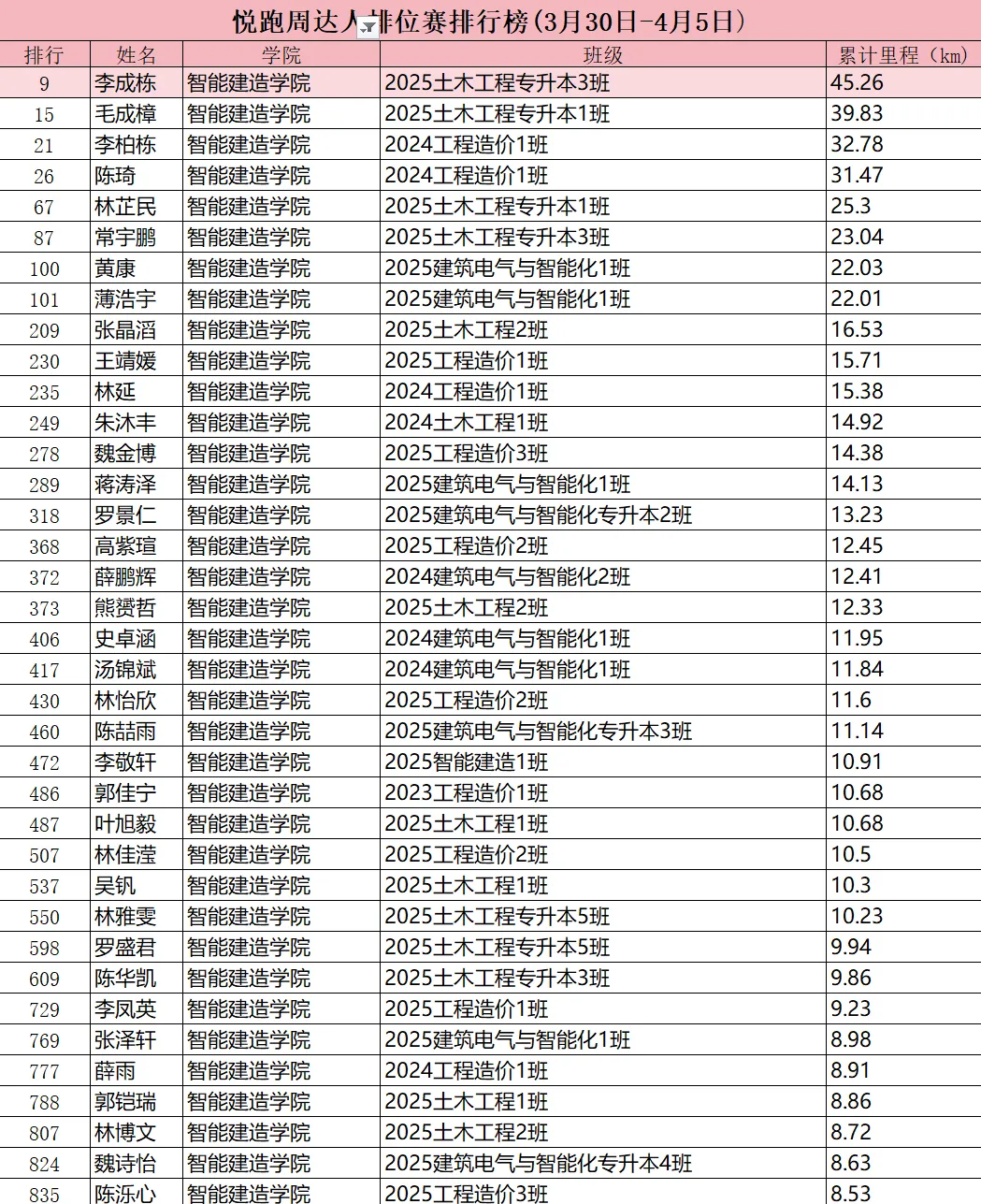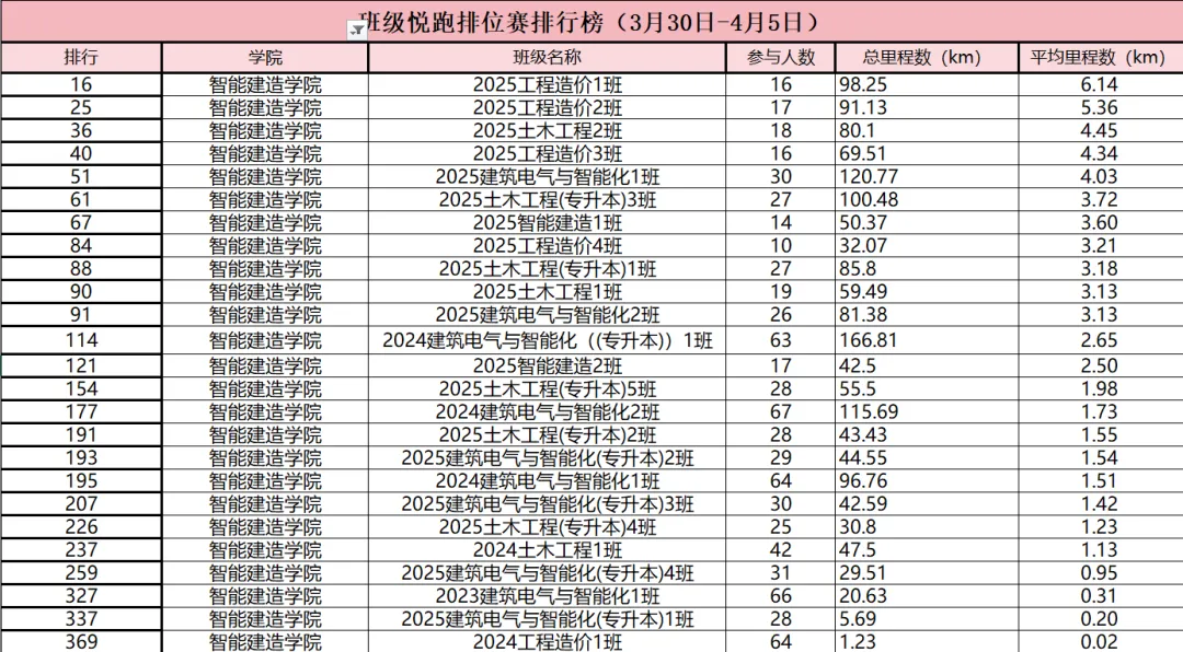 在每一次并肩奔跑里迸发智能建造学院的团队活力,于每一步携手前进中绽放青春光彩!期待更多班级与个人踏入悦跑征程,在协作运动里收获健康与凝聚力,在同心奔跑中镌刻独属于智能建造人的青春华章!
