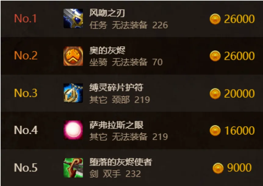 本周风剑价格首次超越凤凰,因为现在可以进行凤凰坐骑的摸奖,所以价格没有之前那么高了,可以直接去打凯尔萨斯,每周可以进行大量的摸奖。但是风吻之刃的价格依然很高,是目前除橙杖外最贵的装备,风剑适配的职业其实并不多,价格如此之高确实令人意外。1~5名仅一个紫装上榜,那就是堕落的灰烬使者,其属性对于PVE的近战职业来说非常优秀,加上其独特的外观,一般都是10000G左右。排名 6~10 的装备