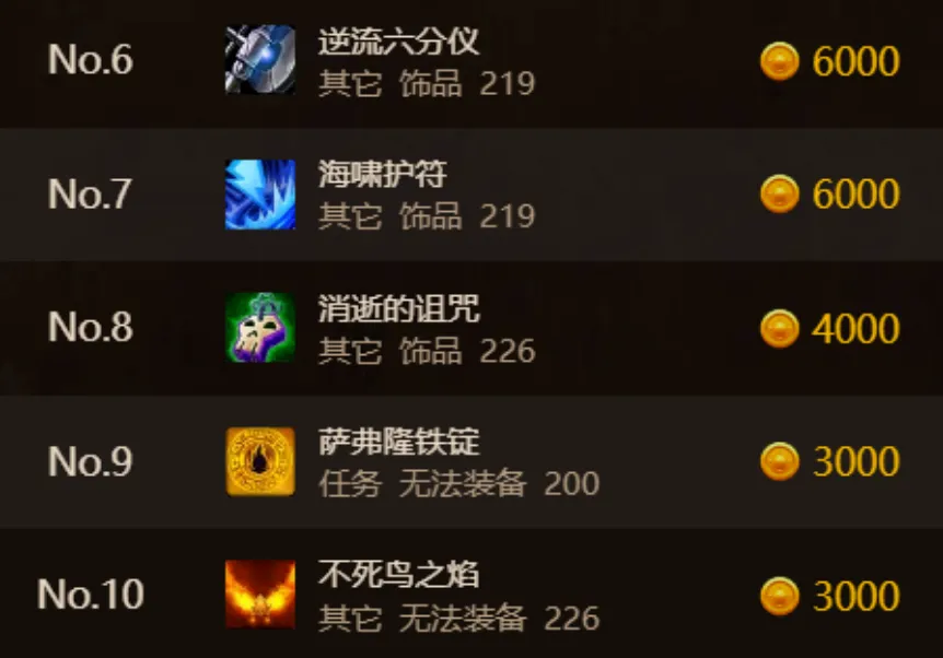 6~10装备中有4件还是P1和P2的道具,其中海啸护符和六分仪依然很能打,对于所有物理系和法系来说,这两个饰品依然拿不下去。唯一上榜的P3装备是消逝的诅咒,这是P3三本里面唯一一个能比肩六分仪的饰品,不过其价格依然是比不上六分仪的。P1掉落的铁锭价格依然很高,因为橙锤制作的特殊性,铁锭的价格也很稳定,包一个铁锭怎么都要3000G左右。排名 10~15 的装备