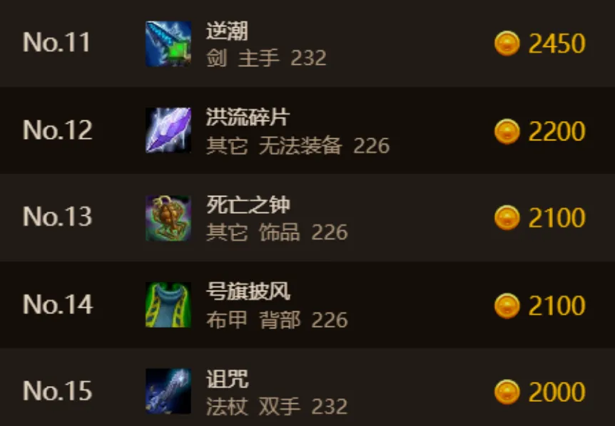 逆潮的属性非常优秀,急速+暴击+法强完美适配所有法系,目前的第一法系武器,所以价格较高,另外上榜的还有法系的BIS披风和仅次于逆潮的诅咒,诅咒和逆潮的差距并不大,但是可以不用买主副手,确实很香。