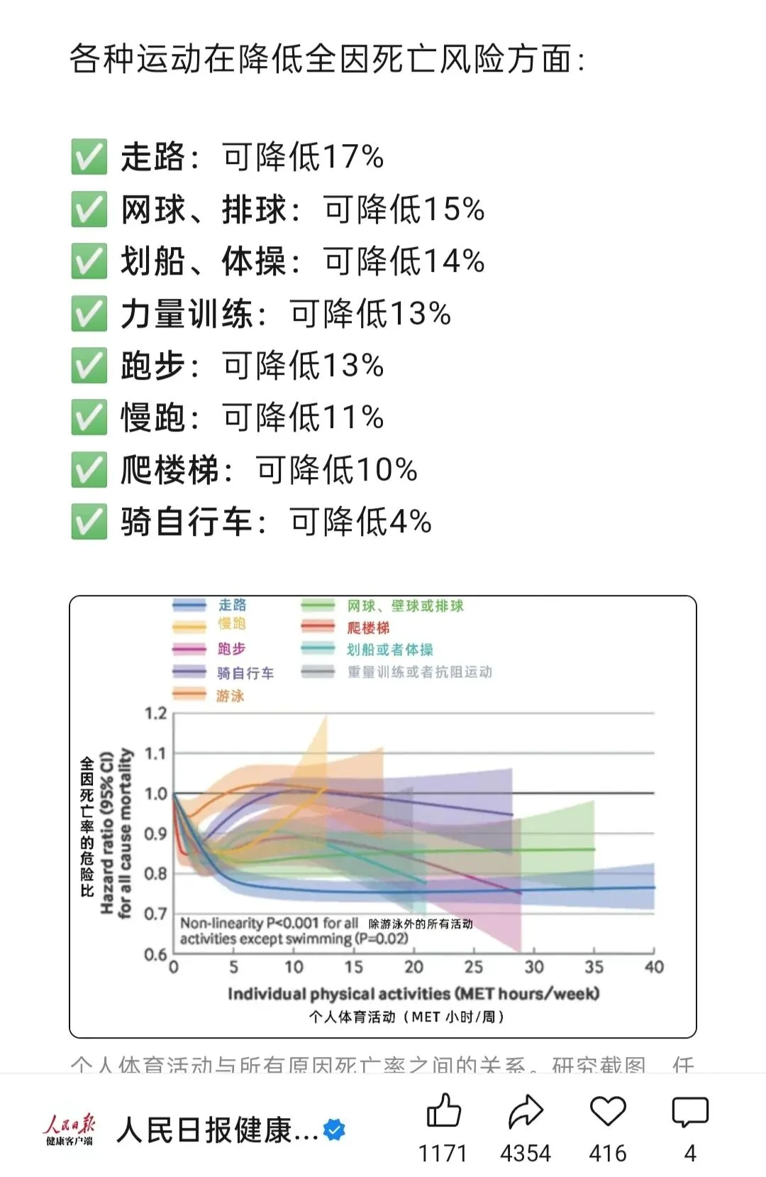 哈佛大学用了30年研究揭示了4大核心发现:走路是性价比之王。走路降低17%死亡风险,远超跑步(13%)、骑行(4%)等,无需器械场地,每天快走30分钟即可达标。