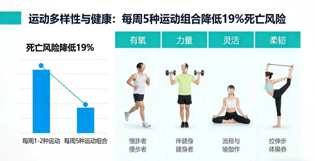 每周5种运动组合比1-2种死亡风险低19%,有氧+力量+灵活+柔韧四类缺一不可: