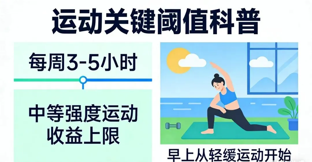 每周3-5小时中等强度(如快走)即达收益上限,盲目加练效果不增反增损伤风险,什么时候做什么运动,灵活安排就好,一般由轻缓的运动开始,慢慢再去做力量的灵活的比较激烈一点的运动。尤其是早上不要一下子就猛烈做运动。