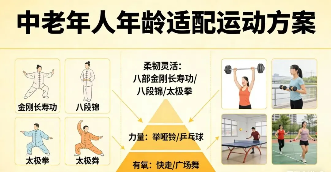 ▶中老年人:八部金刚长寿功/八段锦/太极拳 +举哑铃+快走 +乒乓球/广场舞