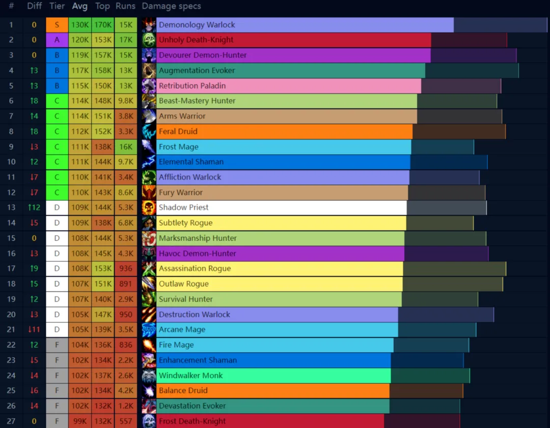 魔兽世界12层以上的大秘境各个职业伤害排名情况如下: