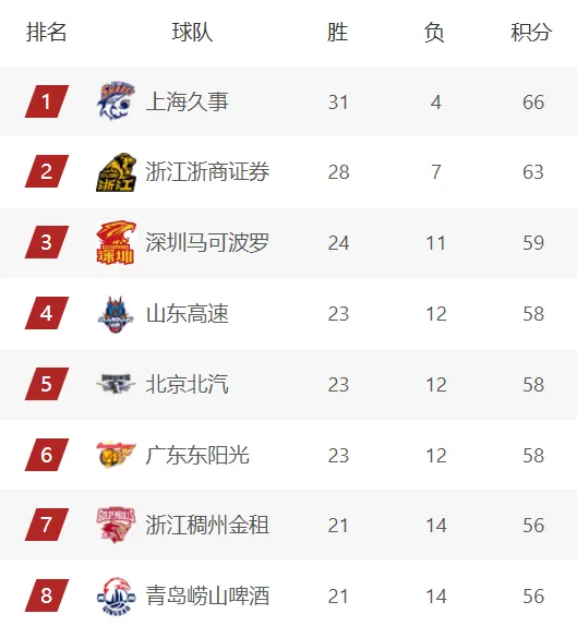 CBA积分榜最新排名出炉!广东输球跌至第6:深圳第3辽宁第10