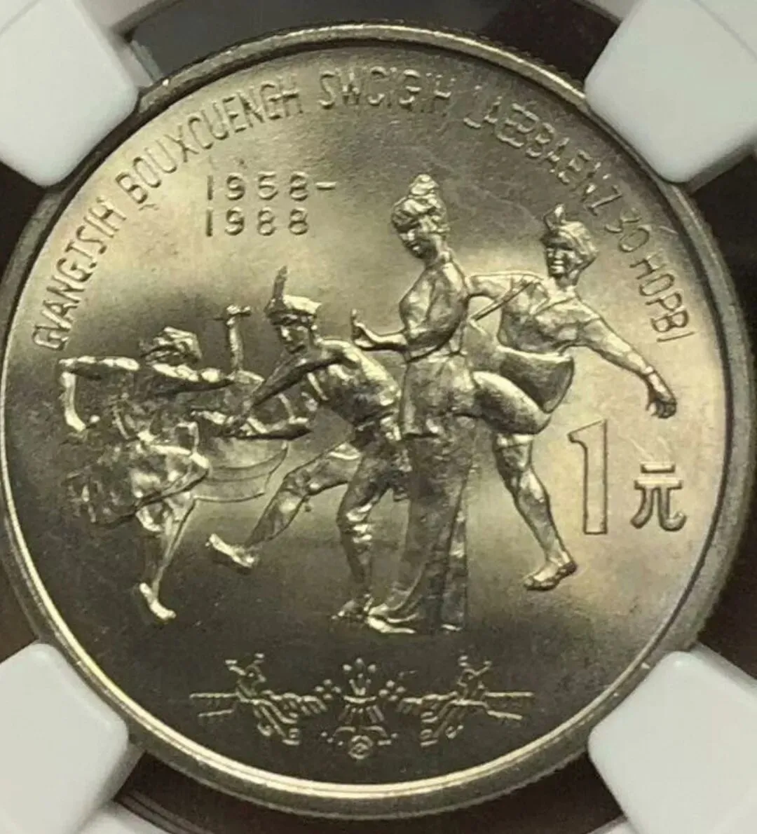 1988年发行宁夏回族 自治区成立30周年纪念币,普制币发行量156万枚,是我国发行量最少的流通纪念币之一。目前市场价格全新品1000元左右。
