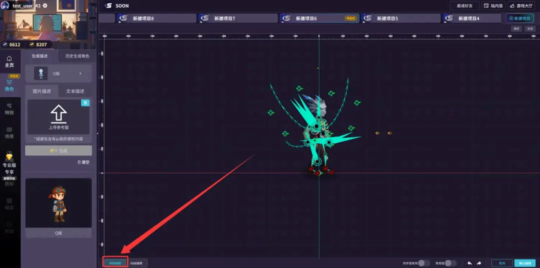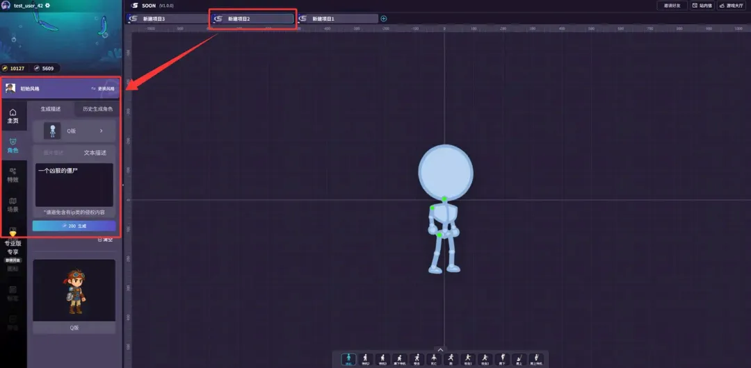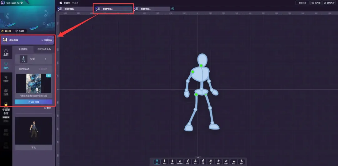 一是上传图片生成,在对应游戏项目中完成风格选择,骨骼选择后,上传角色形象图片,平台自动生成角色;