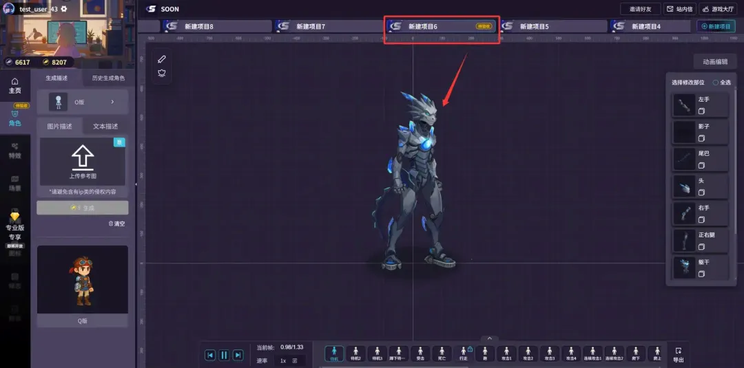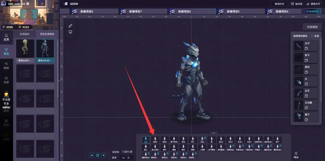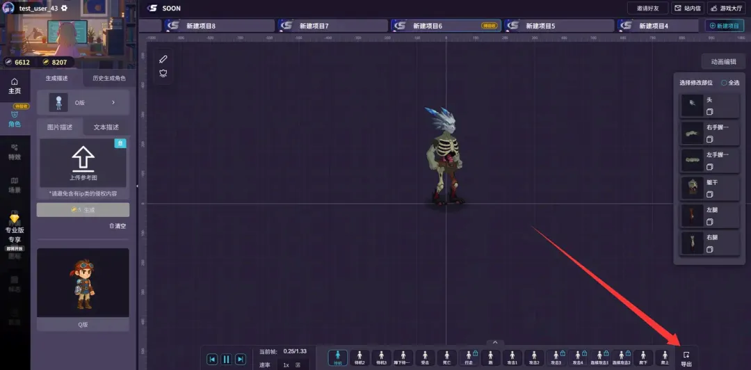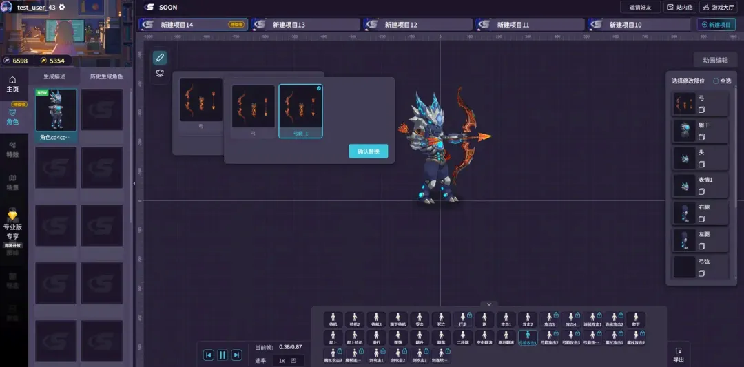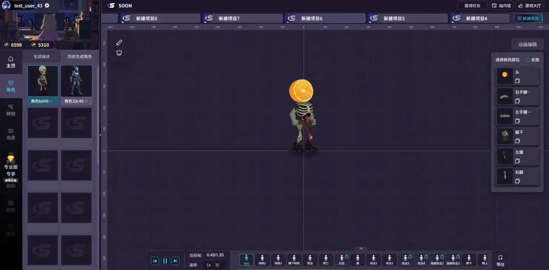 角色是游戏美术资源的核心组成 ,SOON支持生成2D侧颜游戏角色(含多套通用动作),并提供角色编辑、导出等全流程功能,最终可将角色以Spine格式导出。