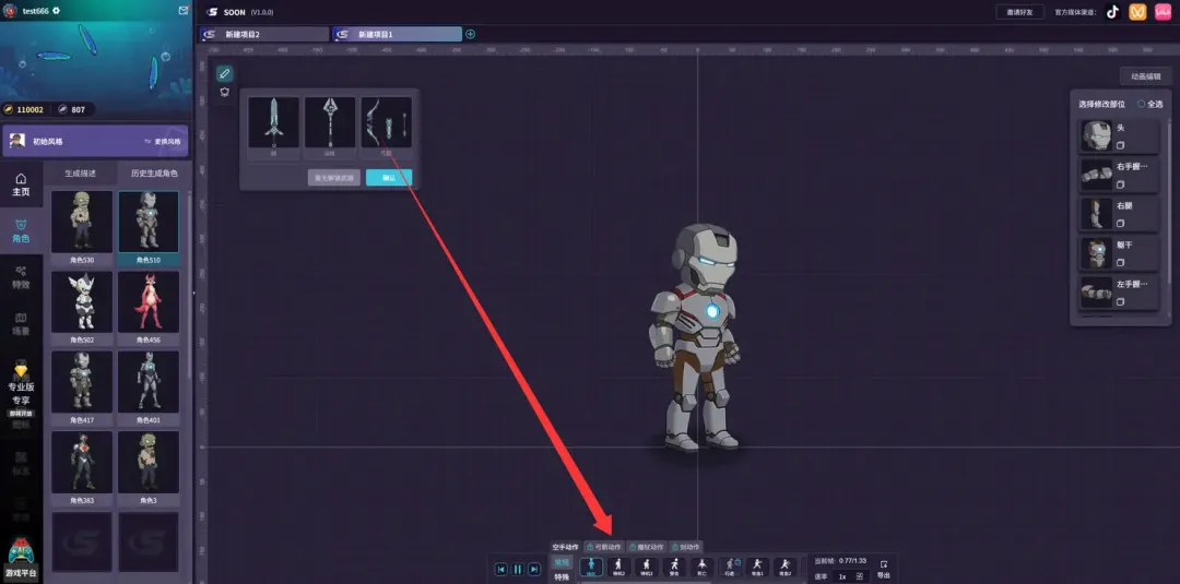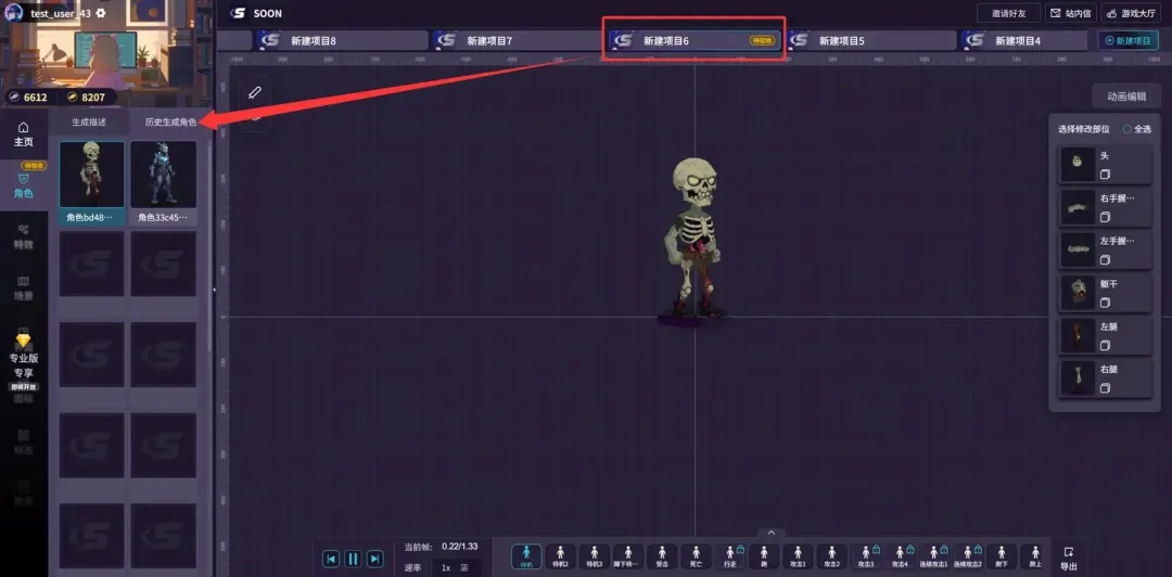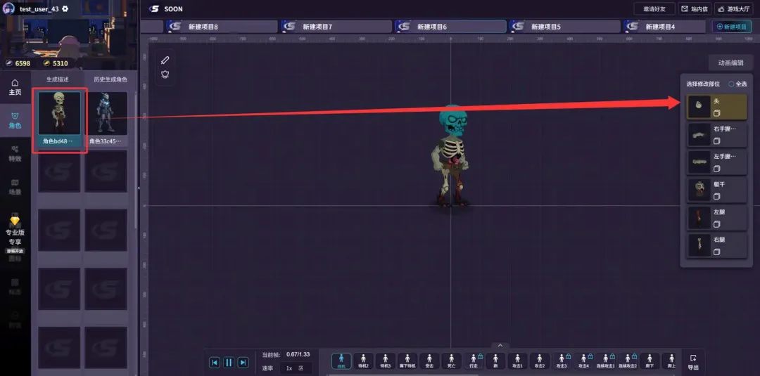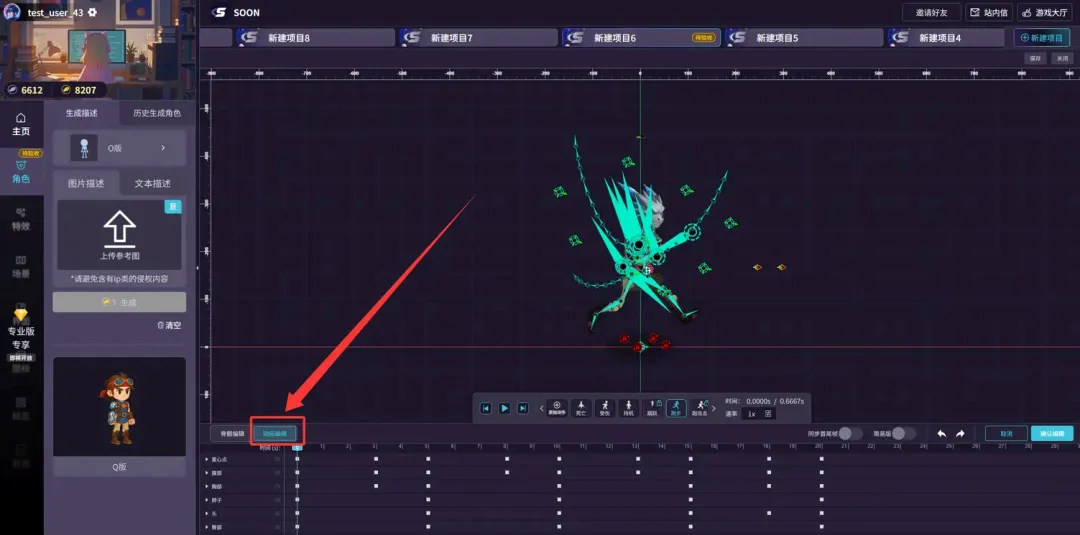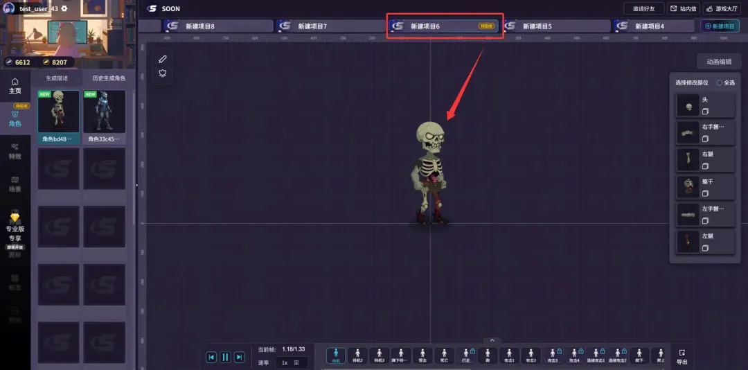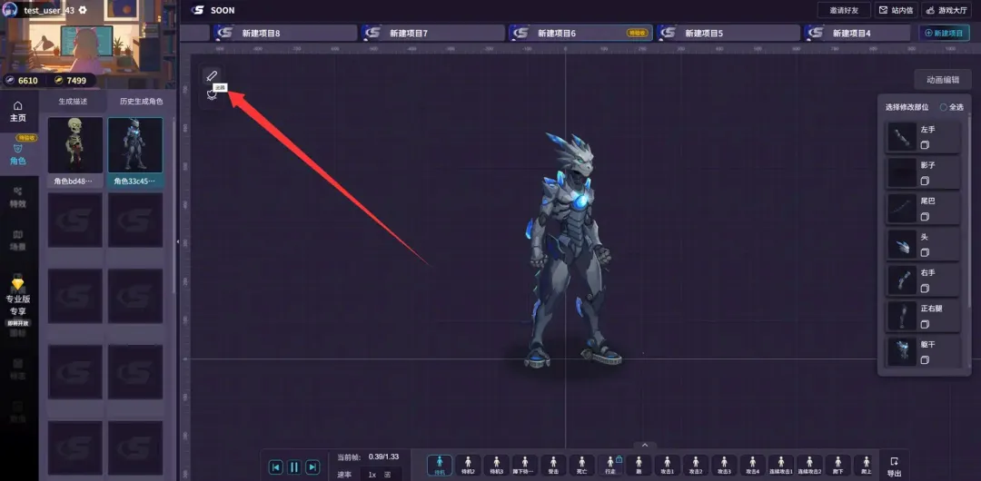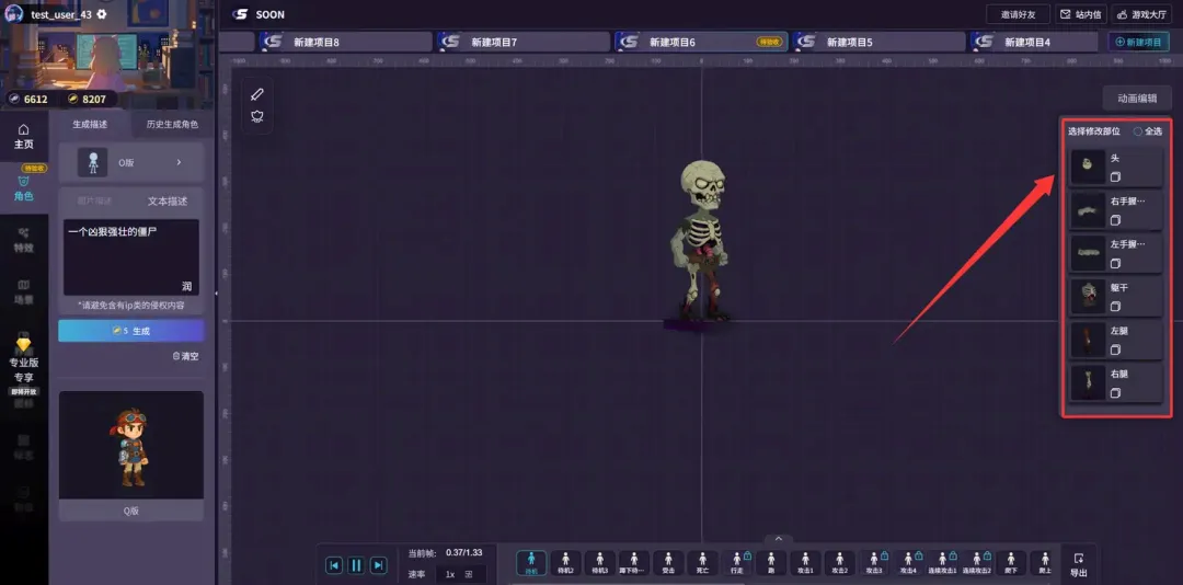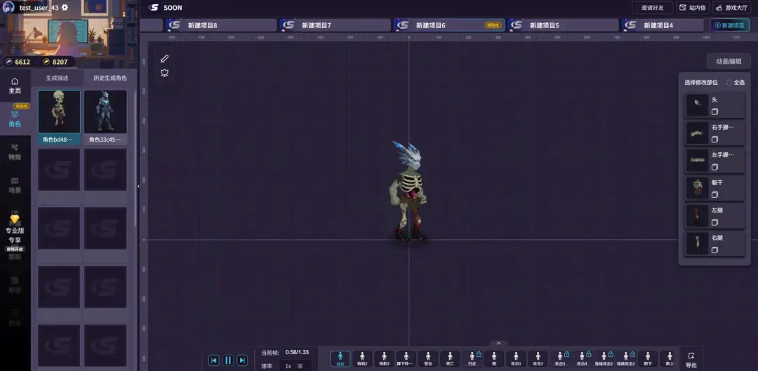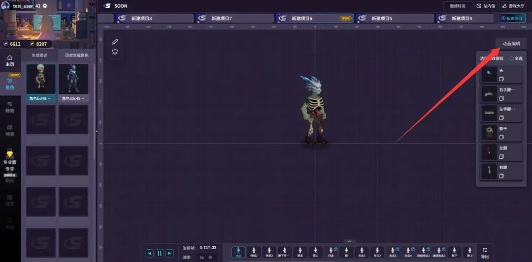 生成的角色动画支持手动自定义编辑,包含部位编辑和骨骼/ 帧动画编辑两大核心功能。
