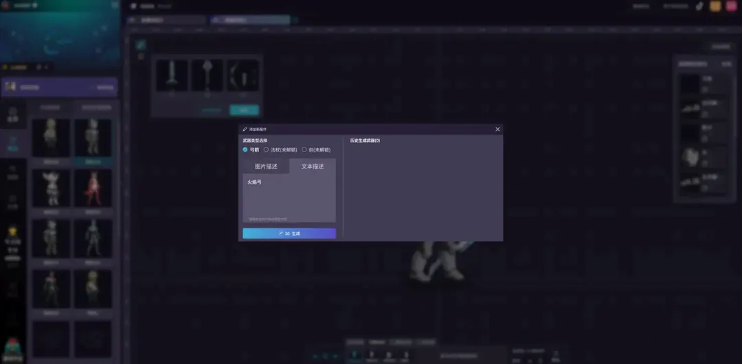 点击添加新配件,选择武器类型,填写武器描述文字或上传武器参考图片,点击生成即可获得定制武器。
