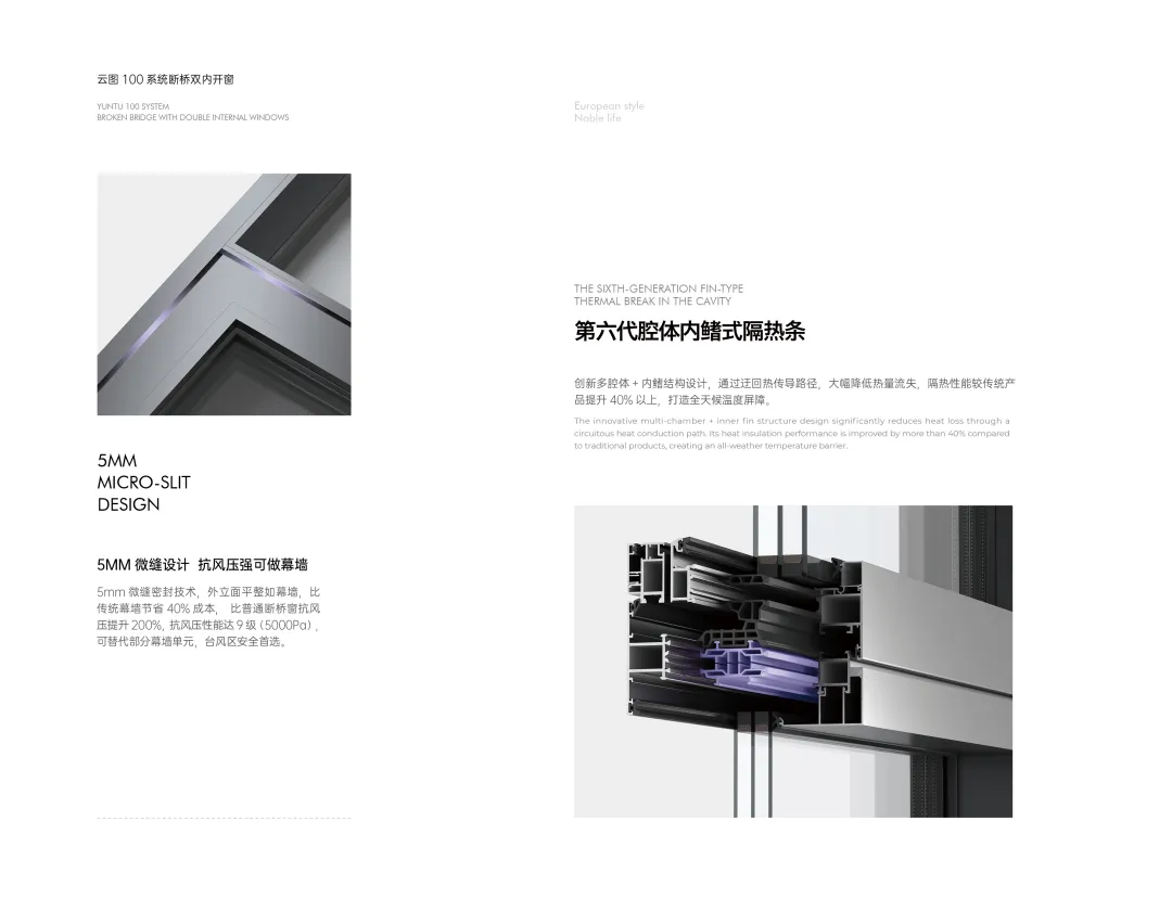 全系采用断桥铝型材,搭配第六代腔体内鳍式隔热条,阻断室内外热量传递,夏季阻挡室外热浪入侵,冬季锁住室内暖气不外泄,降低空调/暖气负荷 30% 以上。