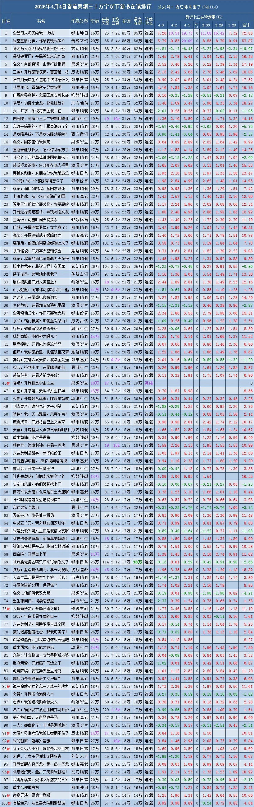 番茄新书榜范围:30万字以下、已签约未下架、已经开始推荐的且未断更,完结未超过90天的番茄原创作品