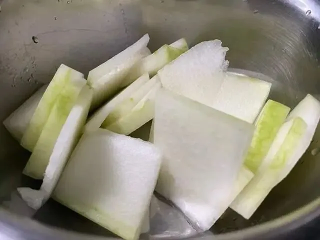 冬瓜去皮,然后切片,再切点葱花和姜丝备用。