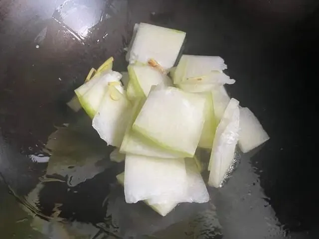 起锅烧油,放入冬瓜翻炒,加点姜丝一起翻炒,因为冬瓜性寒,加点姜丝可以互补。