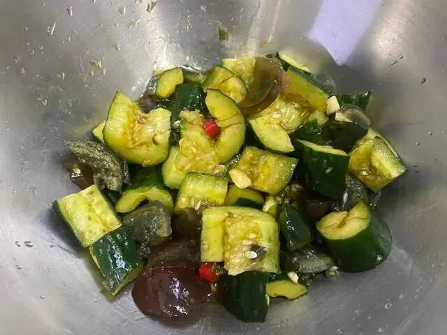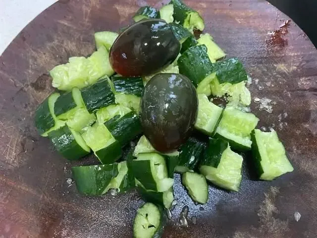 黄瓜加皮蛋,加蒜末和小米椒,然后加醋和酱油,撒些白糖搅拌均匀,就可以出锅了。
