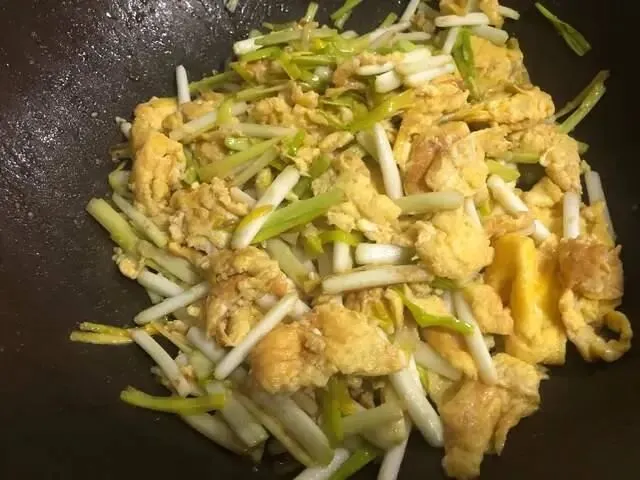 锅中加少许油,放入韭黄翻炒,炒至断生,加点盐,再加鸡蛋一起翻炒均匀就可以了。