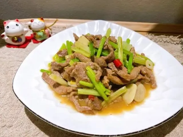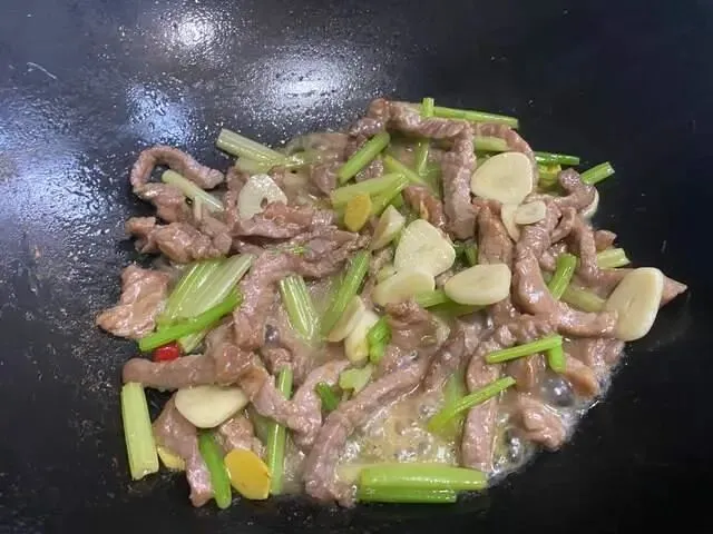 锅中加姜蒜片和芹菜翻炒,然后放入牛肉一起翻炒,加些料酒和生抽调味,翻炒均匀就可以出锅了。