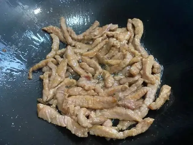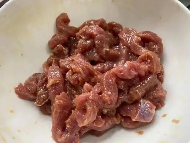牛肉切丝,加点生抽、盐、胡椒粉和生粉抓匀,然后再加点食用油抓匀备用。
