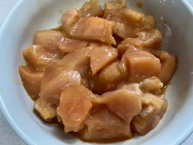 鸡胸肉切丁,加盐、生抽、料酒和生粉抓匀,再加食用油抓匀 备用。