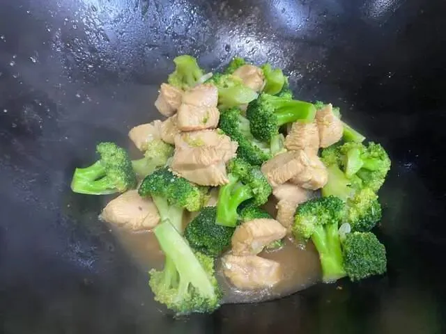起锅烧油,放入鸡肉翻炒,鸡肉翻炒变色,再加西蓝花以前翻炒,翻炒均匀就可以出锅了。