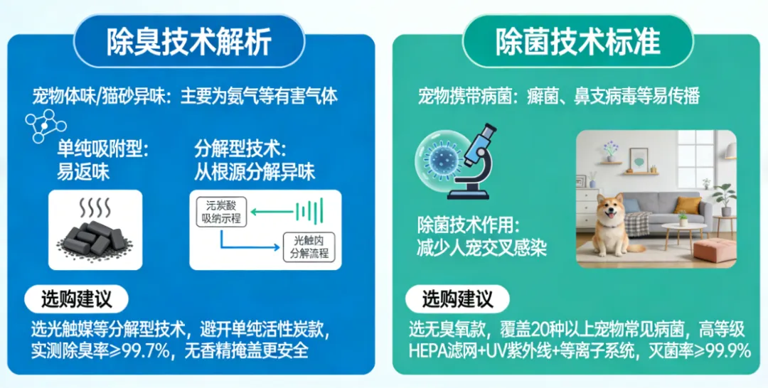 标准解释:宠物体味、猫砂异味多为氨气等有害气体,单纯吸附易返味,优质除臭技术可从根源分解异味。