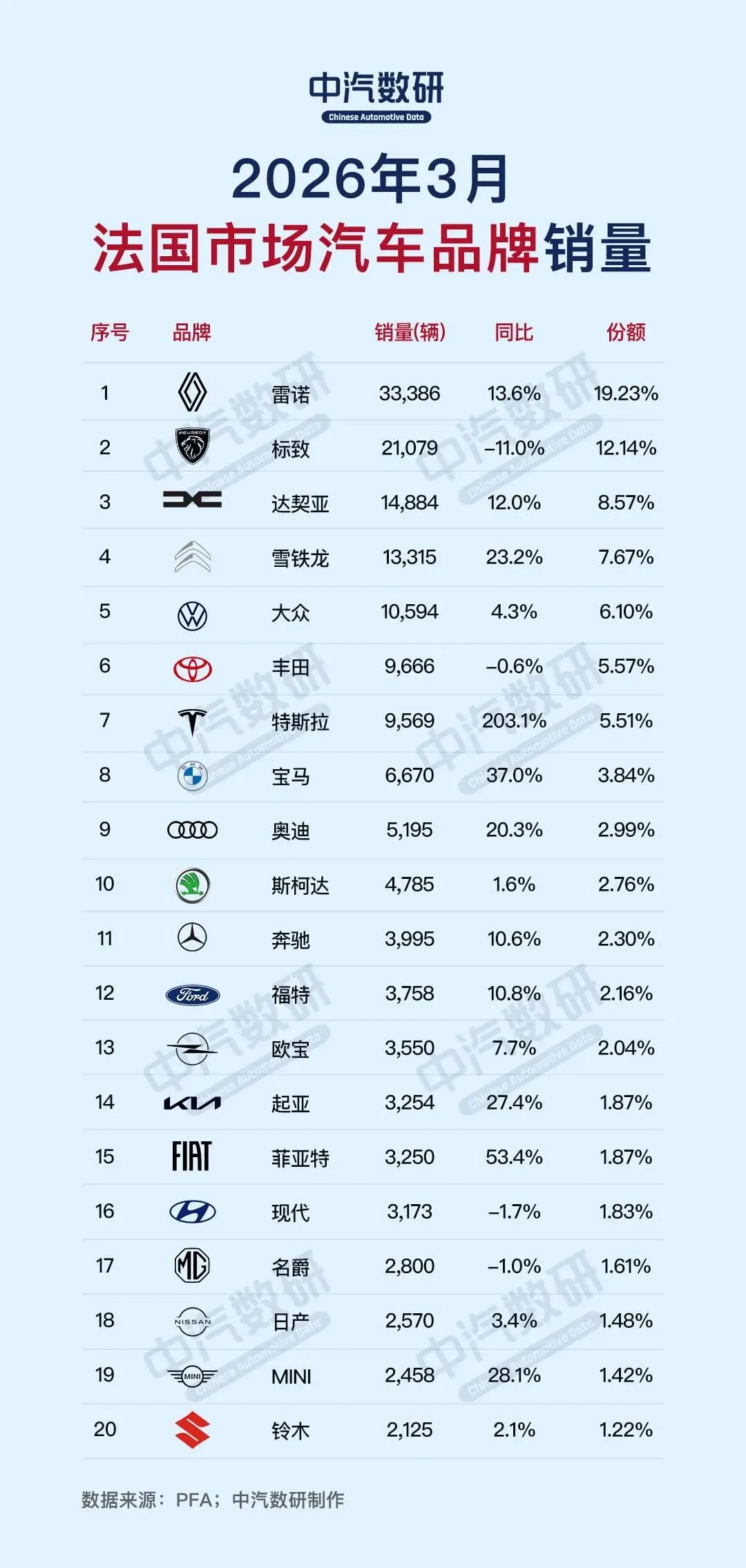 2026年3月,法国新车销量17.36万辆,同比增长12.9%;1-3月法国新车累计销量40.16万辆,同比下降2.1%。