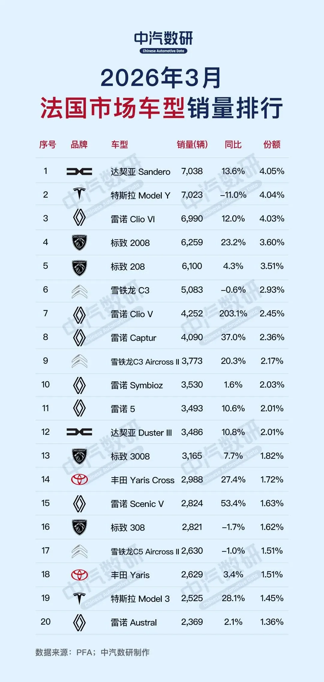 达契亚Sandero以7,038辆的销量登顶车型榜,特斯拉Model Y(7,023辆)和雷诺Clio VI(6,990辆)分别位列第二至三名,标致2008、208分居榜单第四至五位。