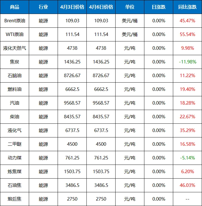2026年(4.6)能源大宗商品价格涨跌榜