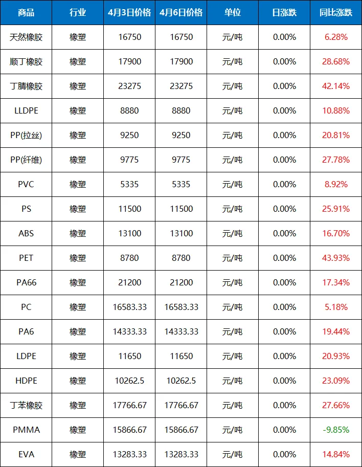 2026年(4.6)橡塑大宗商品价格涨跌榜