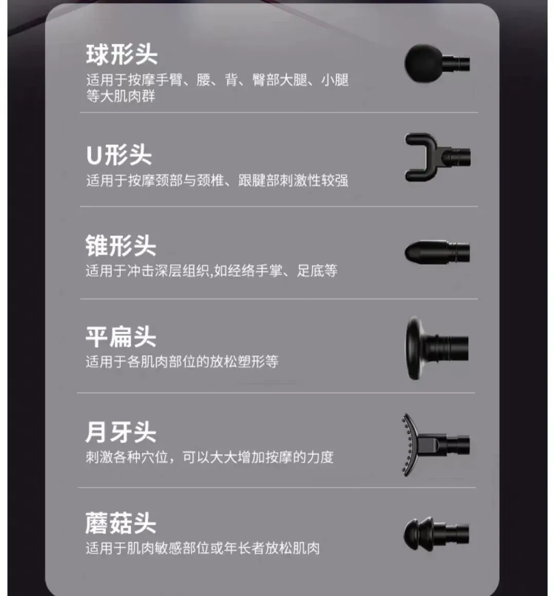 配件层面:标配的6款专业按摩头绝非凑数。球形头用于大肌群放松;U形头精准卡位脊柱两侧与跟腱;锥形头针对痛点精准打击;平扁头用于大面积舒缓;月牙头贴合四肢曲线;蘑菇头呵护敏感部位。一套配齐,无需额外购买。