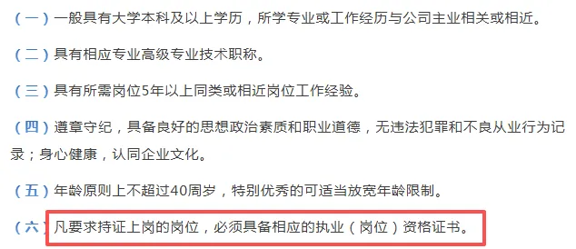 (六)凡要求持证上岗的岗位,必须具备相应的执业(岗位)资格证书。