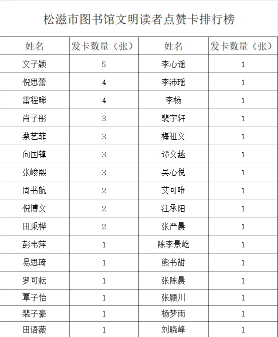 为培养读者良好的阅读习惯,营造文明和谐的阅读环境,提升图书馆的读者满意度,促使更多读者爱上图书馆、爱上阅读,掀起全民阅读的新高潮,松滋市图书馆在全馆范围内开展评选“文明读者”活动,并于每月底公布当月获得“文明读者”点赞卡排行榜。