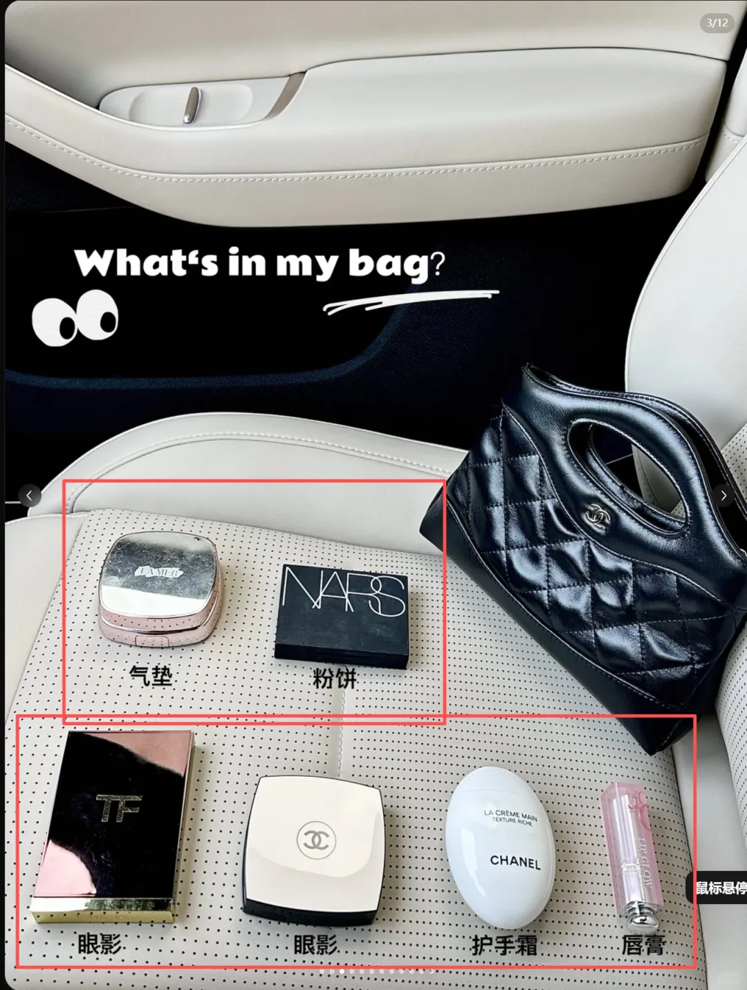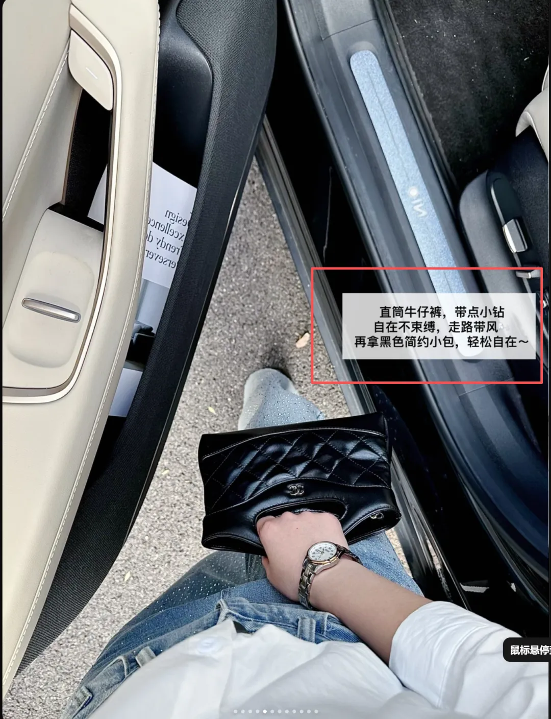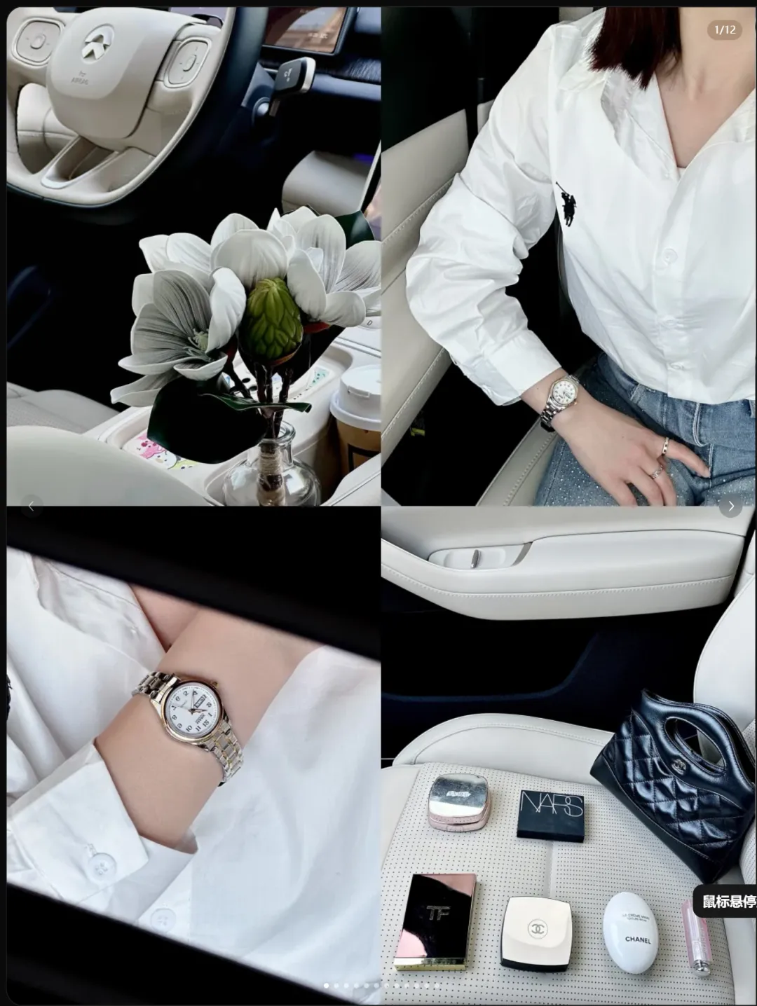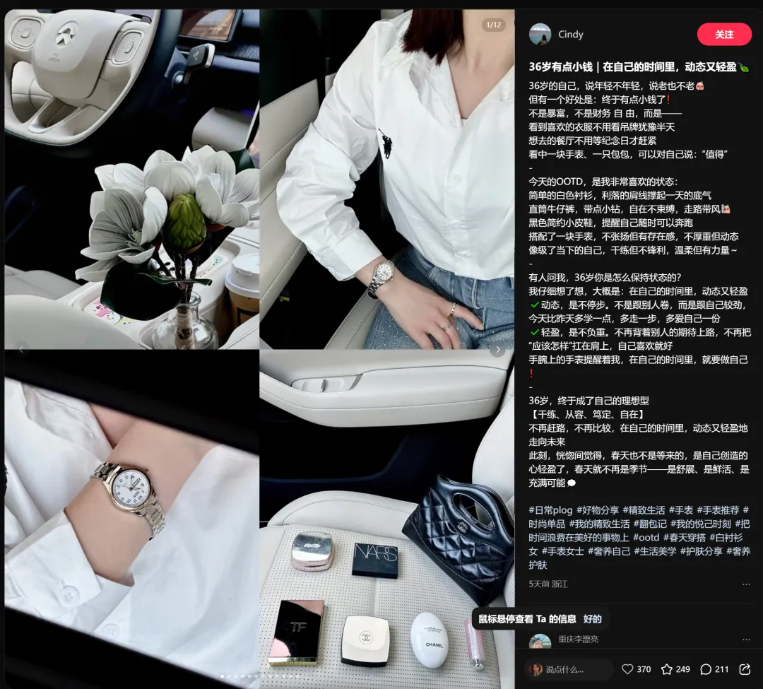 分析:四宫格的拼图,一个是汽车主驾驶位+花的照片,突出了品位;一个是整体穿搭的自拍图;一个是手表的特写图;一个是包内装的物件展示图。