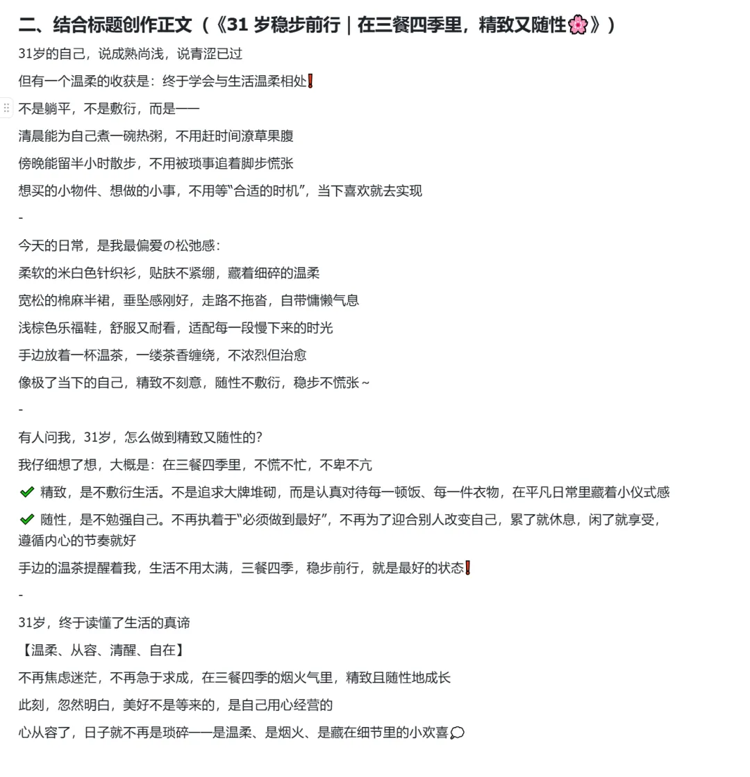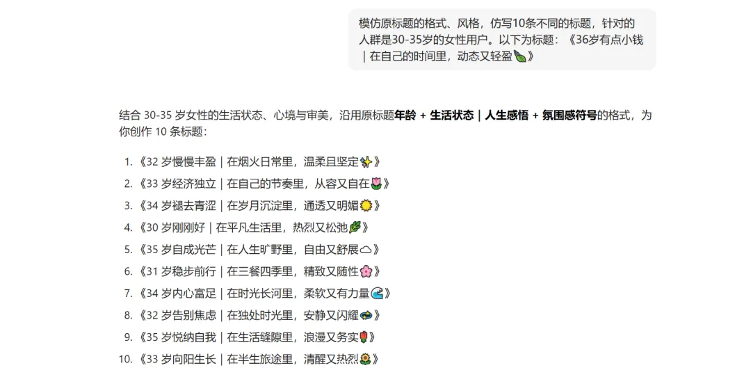 操作方向:直接复制该标题,丢给豆包让她模仿原标题的格式、风格,仿写10条不同的标题,针对的人群是30-35岁的女性用户。