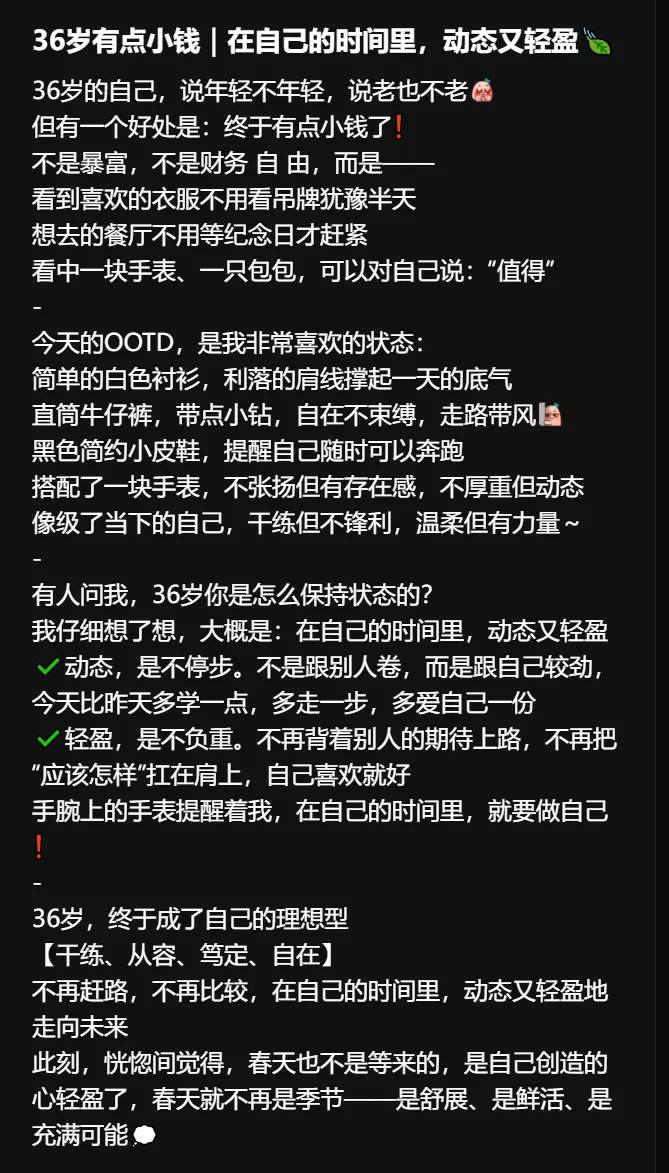 36岁有点小钱|在自己的时间里,动态又轻盈🍃 36岁的... http://xhslink.com/o/8W01YNPXAqf