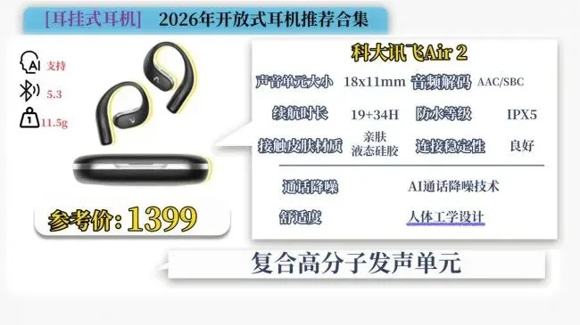 开放式耳机推荐TOP8:科大 讯飞Air 2(¥1399)
