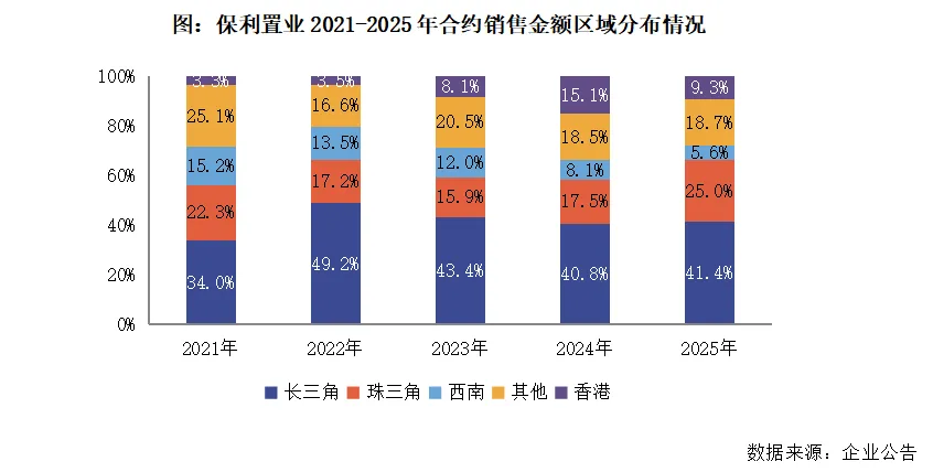 2025年保利置业的合约销售均价达到了30917元/平方米,同比提升了21%,再创近年来的新高;其中内地市场合约销售均价28388元╱平方米,同比上升29%。这主要是因为企业在长三角和珠三角以及香港地区整体的销售额占比达到了75.7%,同比提升了2.3个百分点,也是近年的新高;一线及香港地区的销售额贡献占比达到了52%。