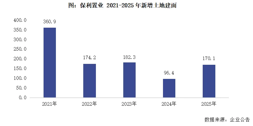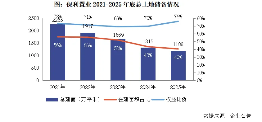 【拿地销售比大幅提高至0.54,重点布局上海杭州广州三个核心城市】2025年保利置业在杭州、济南、广州、上海等8个城市新增了15个项目,新增土储建面为170.1万平方米,按建面计算的权益比例为77.6%。拿地总价约270亿元,按金额计算的拿地销售比为0.54,企业的拿地力度大幅提高,且在上海、杭州和广州三个核心城市的投资占比达到了84%。截至2025年底,保利置业的总土储建面为1188万平方米,同比减少了9.8%。