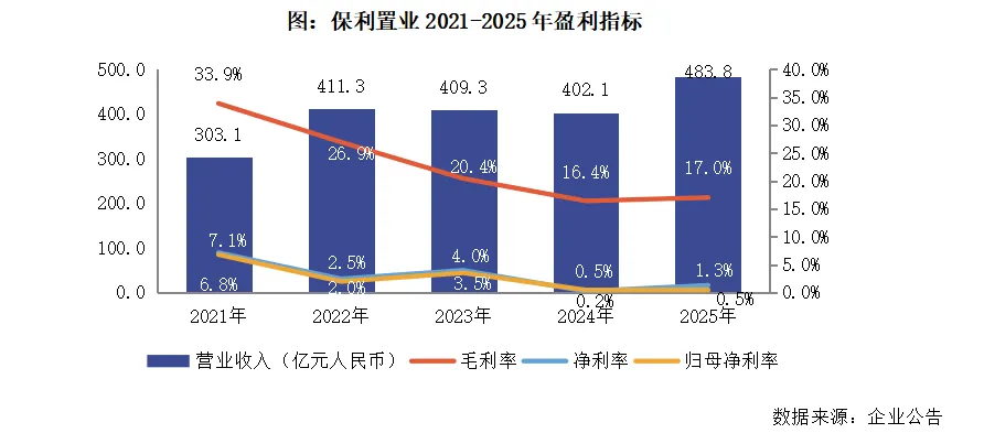 2025年保利置业的营业收入为483.8亿元,同比增长20.3%;毛利润同比增长了24.8%至82.34亿元,毛利率同比提升了0.6个百分点至17.0%。