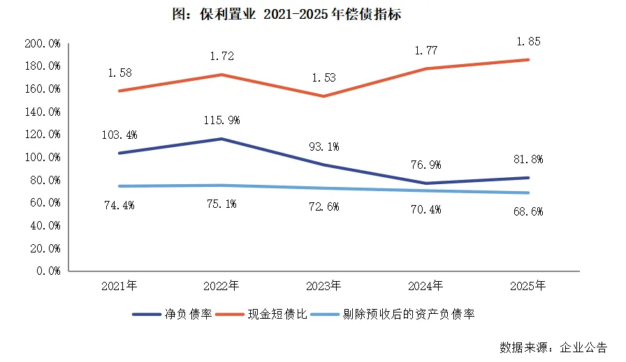 【融资成本持续下行,三条红线指标首次转绿】保利置业在2025年完成了4笔共50亿元公司债券以及2笔共15亿元的中期票据的发行,票面利率均低于2.8%,推动企业平均融资成本同比继续下降了0.53个百分点至2.86%,企业仍然保持着较强的融资能力。期末保利置业的持有现金同比减少了10.1%至311.62亿元人民币,短期有息负债减少了14%至168.17亿元。现金短债比提高至1.85。企业的净负债率为81.8%,剔除预收款后的资产负债率降低了1.9个百分点至68.6%,全年的三条红线指标首次达到绿档,企业财务状况持续优化。
