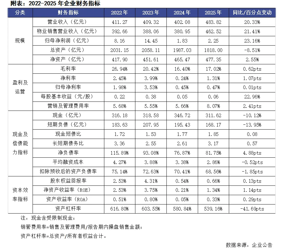 2025年底企业的总有息负债同比减少0.4%至701.86亿元,净负债率同比提升了4.9个百分点至81.8%,剔除预收款后的资产负债率也降低了1.9个百分点至68.6%,全年的三条红线指标首次达到绿档,企业财务状况持续优化。