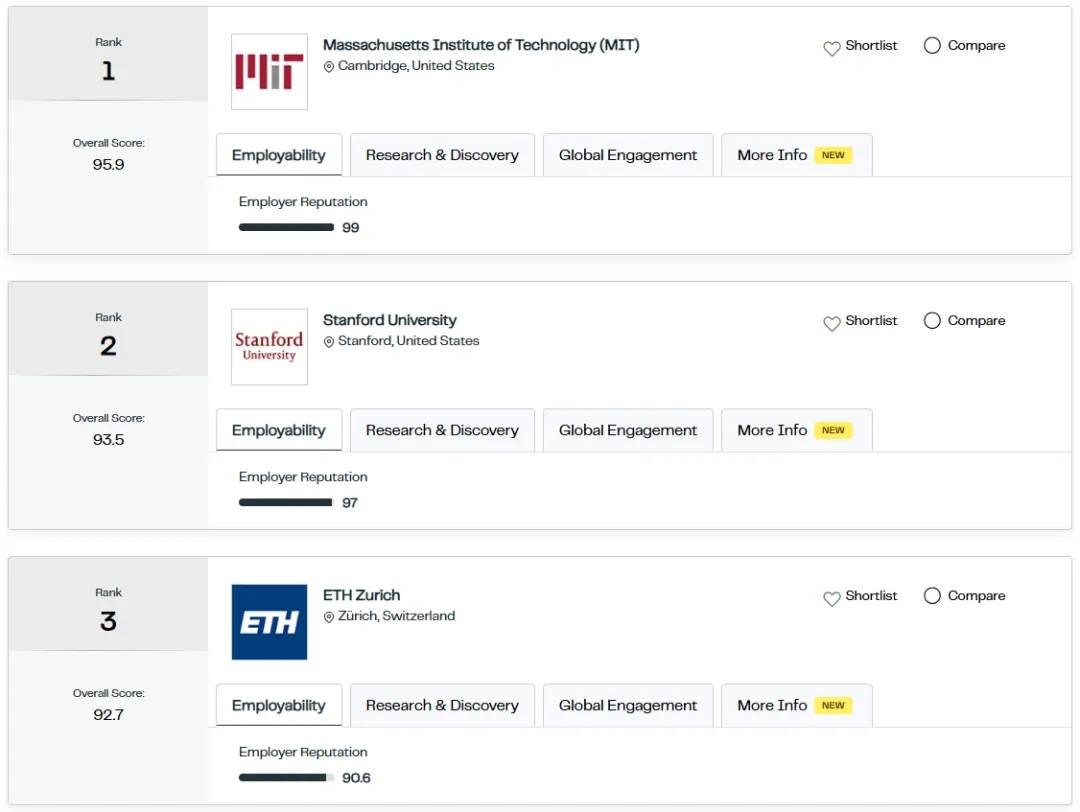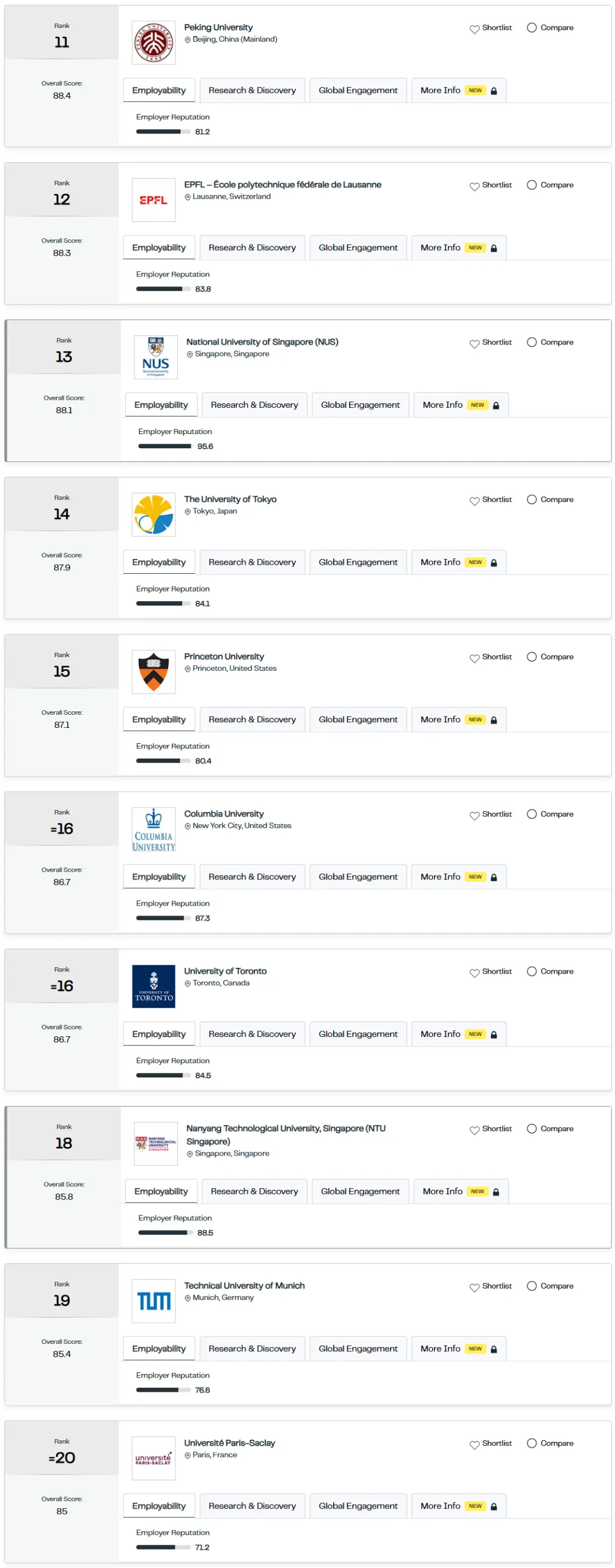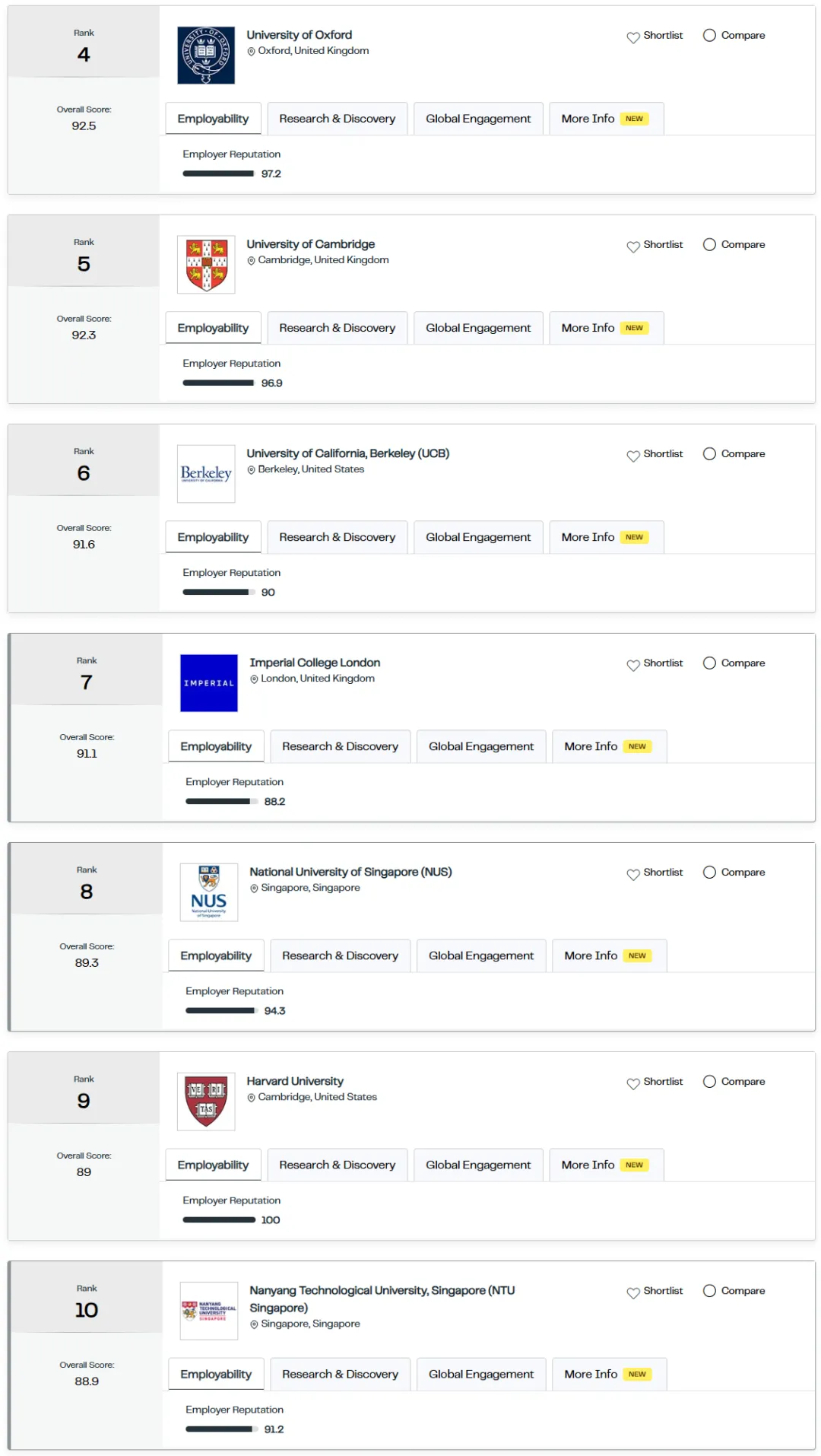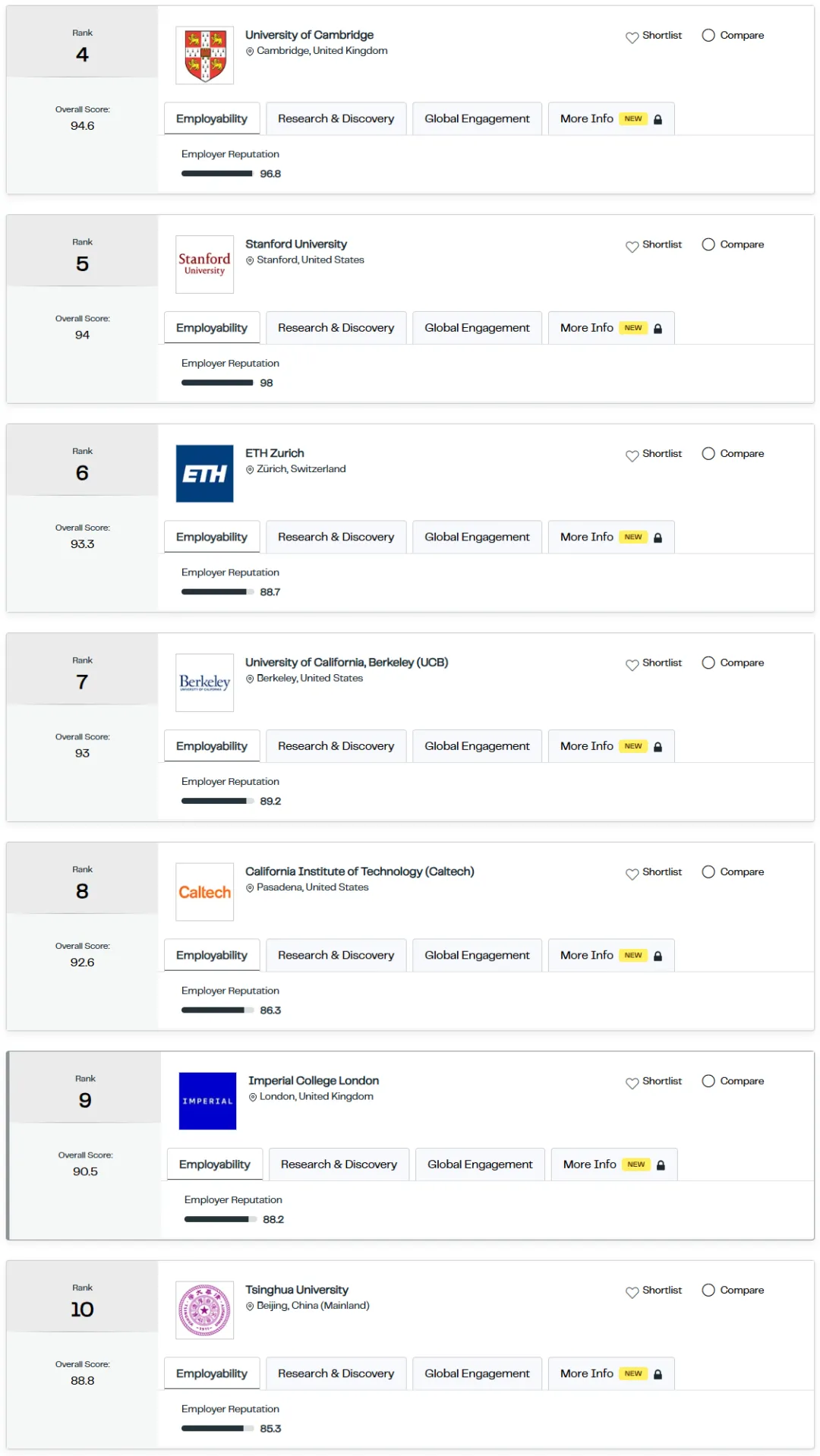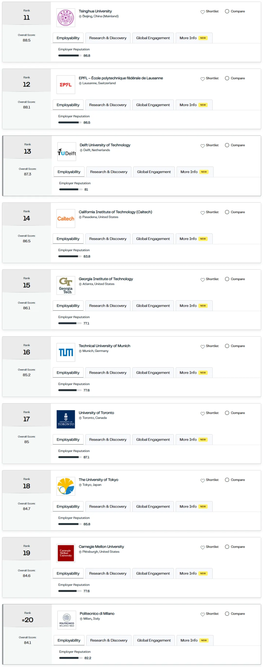牛津大学(University of Oxford)和剑桥大学(University of Cambridge)分别位列于第四、第五,帝国理工学院(IC)上升一名至第七。麻省理工学院(Massachusetts Institute of Technology)仍旧处于领先地位,苏黎世联邦理工大学再次提升至第三名。新加坡国立大学位列第八和新加坡南洋理工大学第十,是前十唯二两所亚洲高校。