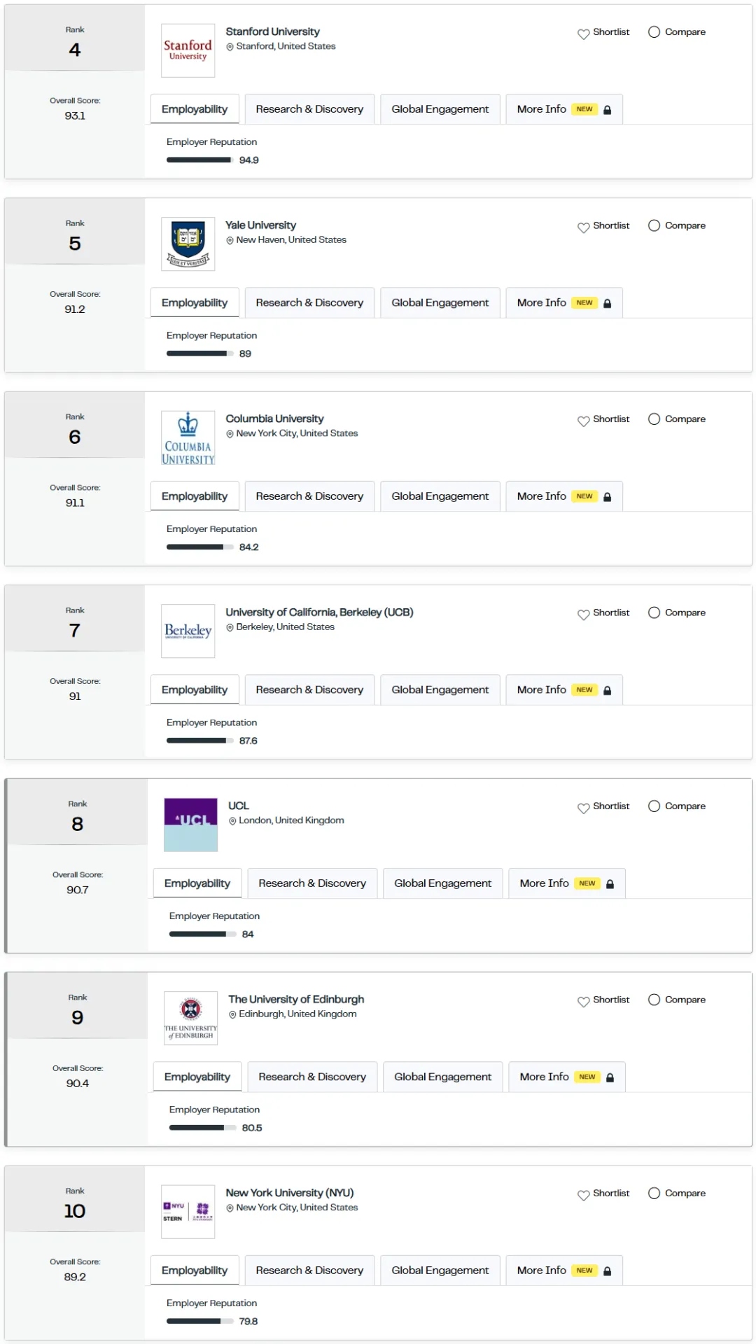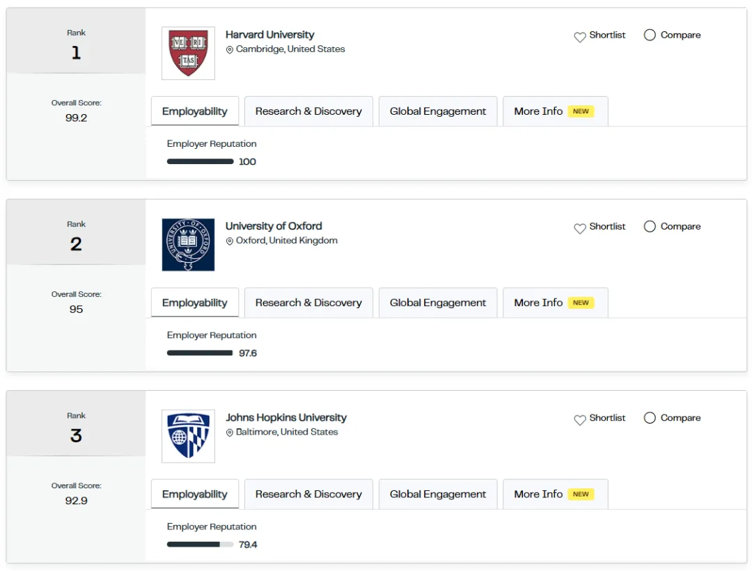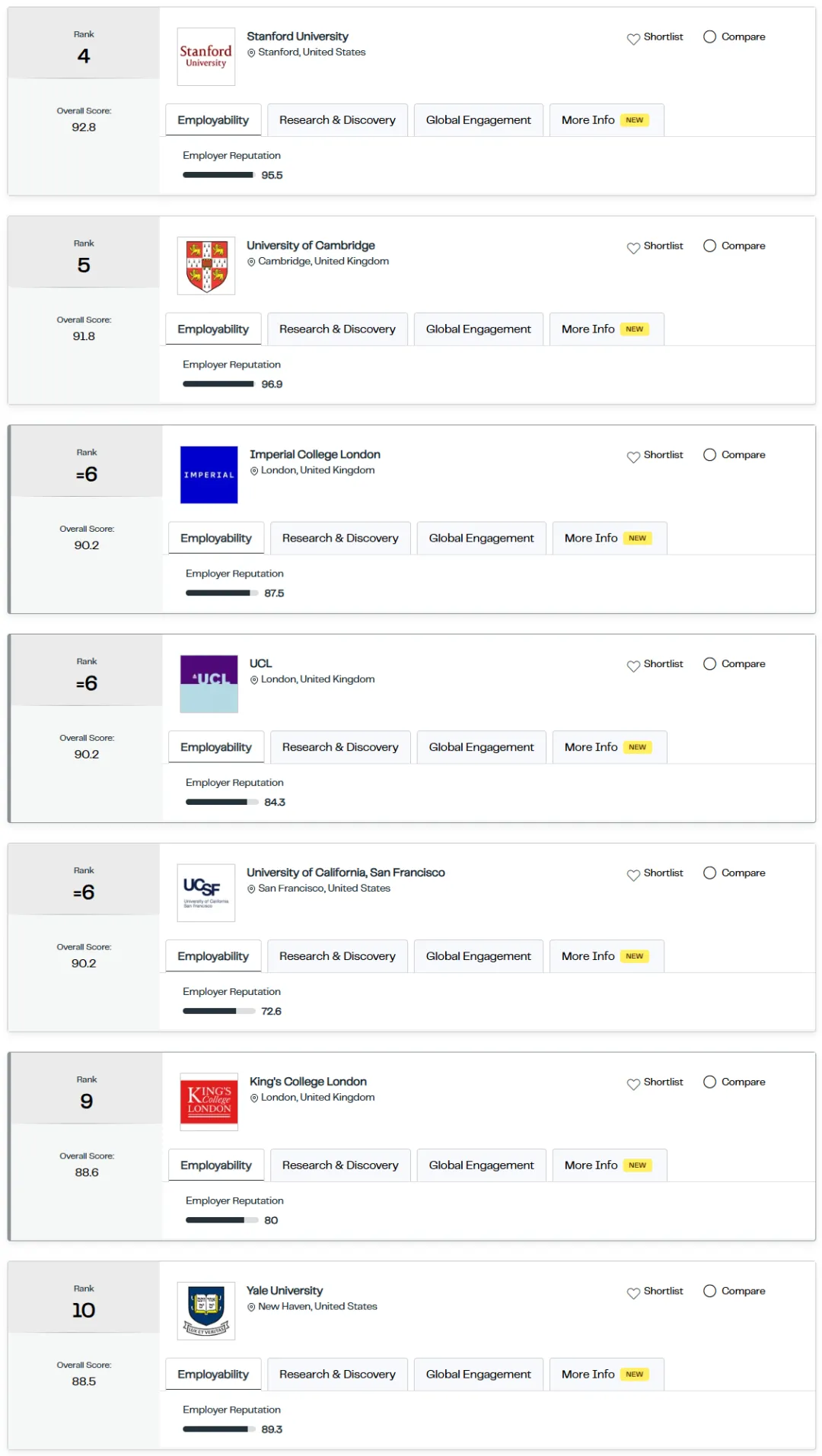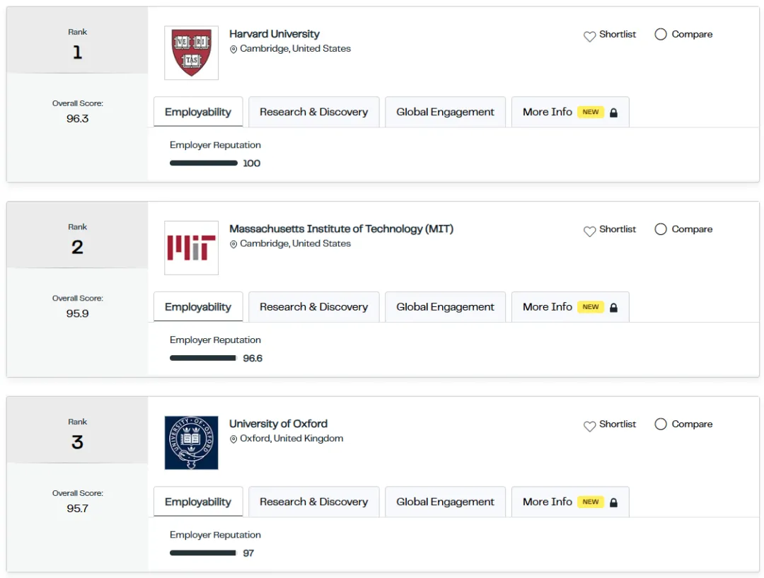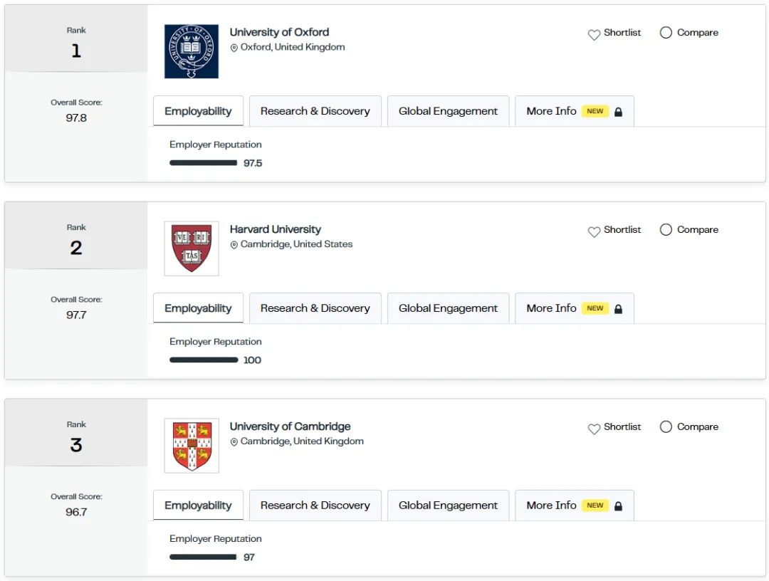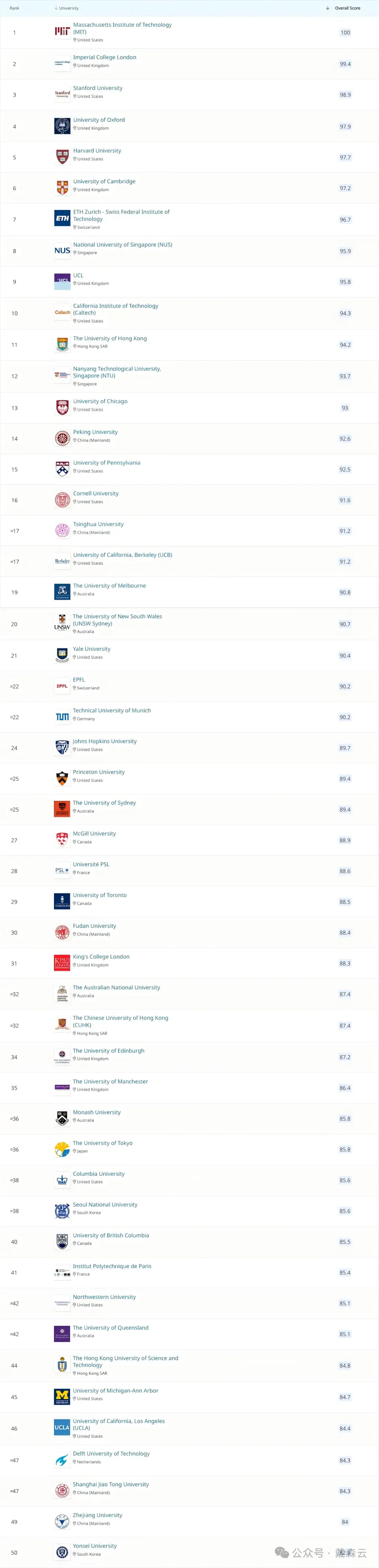 牛津大学(University of Oxford)和剑桥大学(University of Cambridge)分别位列于第四、第五,帝国理工学院(IC)上升一名至第七。麻省理工学院(Massachusetts Institute of Technology)仍旧处于领先地位,苏黎世联邦理工大学再次提升至第三名。新加坡国立大学位列第八和新加坡南洋理工大学第十,是前十唯二两所亚洲高校。