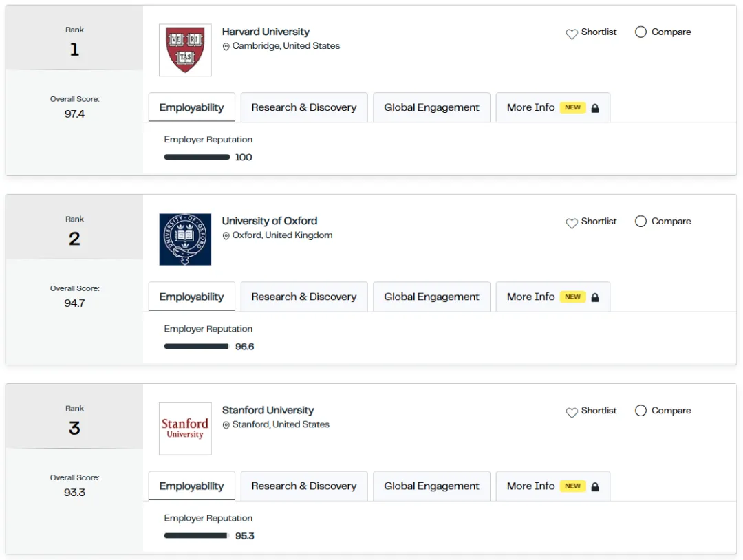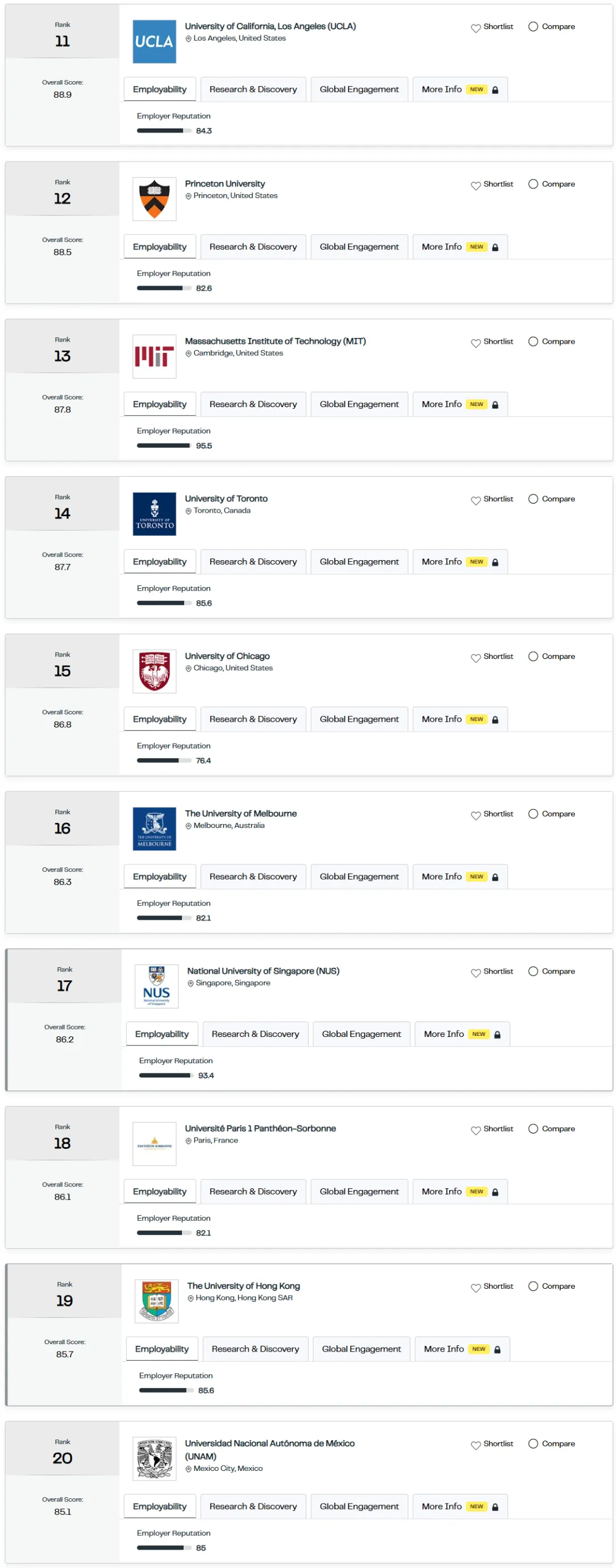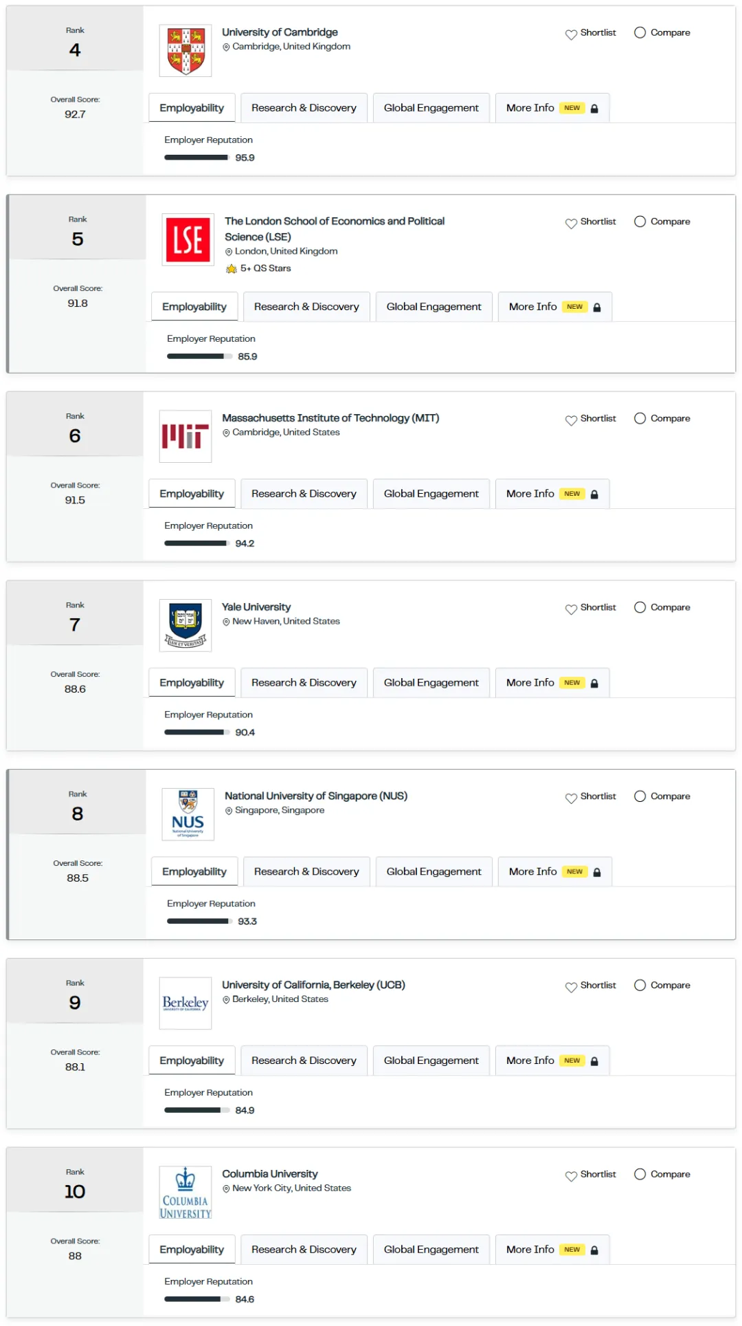 《QS世界大学排名》(QS World University Rankings)为英国Quacquarelli Symonds所发表的年度大学排行榜。目前,QS公司与爱思唯尔合作发布排名,榜单涵盖世界综合与学科,另有亚洲、新兴欧洲与中亚地区、拉丁美洲、阿拉伯地区、金砖五国共五个持不同准则的地区排名。所以迄今为止QS World University Rankings 是世界上引用最多、覆盖面最广的世界大学表现比较数据源。QS根据不同主题目标来排名评估大学的表现。评估考量了大学的教学、培养、研究、就业能力和国际化等综合水平。 美国,加拿大整体排名变化不大。麻省理工学院(MIT)连续第14年蝉联榜首,成为世界第一大学。帝国理工学院连续两年蝉联全球第二,斯坦福大学上升至第三,牛津大学排名第四,哈佛大学排名第五,剑桥大学位列第六。中国大陆有两所高校进入全球前20,北京大学排名全球第14位,清华大学排名全球第17位。